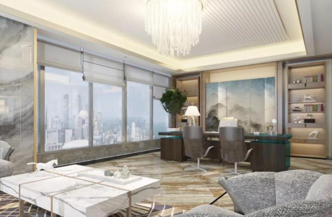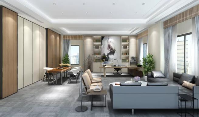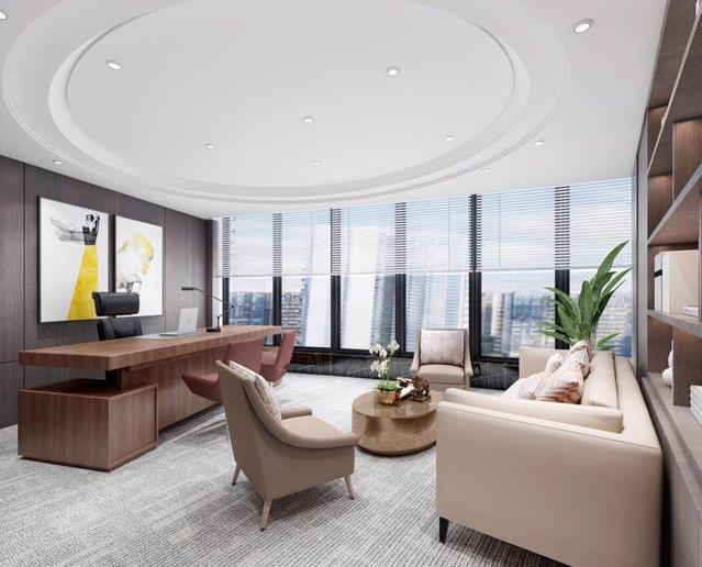 2、現(xiàn)代輕奢風(fēng)辦公樓接待大廳裝修:整個(gè)辦公空間分為頂、墻、地三個(gè)部分,頂面以圓形和橢圓形疊級(jí)吊頂造型裝飾,輕松、休閑的燈光營(yíng)造氛圍,在接待客人談生意時(shí),裝修也能體現(xiàn)一家老板的品味與性格,還有該公司的實(shí)力,公共區(qū)域墻面采用高檔木飾面板裝飾,地面則是地毯滿(mǎn)鋪。總經(jīng)理辦公室裝修設(shè)計(jì)中重要的是超大的落地窗,總經(jīng)理工作上的壓力往往是常人難以感同身受的,站在三十多樓的高樓里,可以一覽城市風(fēng)光,居高臨下俯視這座城市,眺望遠(yuǎn)方舒緩內(nèi)心的壓抑。