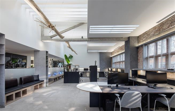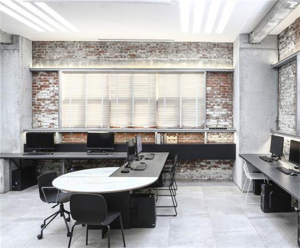 700平米的辦公室裝修設(shè)計:設(shè)計師們保留了老建筑的原始磚墻,只對吊頂做了百葉格柵的造型設(shè)計,與陽光順向的造型也起到了調(diào)節(jié)空間光線的作用,另外這個地方我們還吊掛了一棵一分為二的大樹。使用率較高的地方叫做“工作空間”,把較好的南北方向空間給到整個的工作空間,用較流暢的動線來組合這個部分?!爸獠繀^(qū)域”是我們提出來的一個概念,這一部分區(qū)域完成的是企業(yè)合作伙伴在工作中的協(xié)同作戰(zhàn)訴求,其應(yīng)該被設(shè)置在有獨立出入口的中部空間?!靶蜗髤^(qū)域”是企業(yè)面對客戶的精神堡壘,我們會將其設(shè)置在空間的重點區(qū)位。在辦公室的后邊有一條單獨的樓梯通往樓下的茶室,也就是在一個30平米的位置中,又可以重新組成一個封閉的LOFT空間,滿足我一個人的創(chuàng)意設(shè)計和客人接待需要,這個算是留給自己的一點小私心。