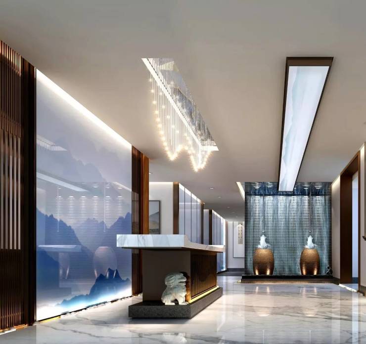 項(xiàng)目采用了禪意文化的手法進(jìn)行設(shè)計(jì),這個(gè)空間即融入了中國傳統(tǒng)風(fēng)格文化與現(xiàn)代時(shí)尚之中,既有中式的古香古色,又有現(xiàn)代的簡單自然,東方韻味在現(xiàn)代的背景下若隱若現(xiàn),簡約的中式造型與現(xiàn)代形式轉(zhuǎn)變?yōu)槭孢m,實(shí)用,為現(xiàn)代辦公設(shè)計(jì)重重的添了一份古典的韻味。禪意辦公室大廳設(shè)計(jì):以現(xiàn)代手法將古典語言融入中式意境,整個(gè)空間散發(fā)出悠然禪文化。頂上一通而過燈飾造型,如同一條河流,在對面機(jī)刨石上如瀑布般潺潺流下,兩個(gè)古樸的老缸不停地冒著噴泉。用較少即多的表現(xiàn)方式直接明了的體現(xiàn)了整個(gè)空間文化氛圍,留白的墻,黑色原始頂,現(xiàn)代中式家具與禪意的辦公桌,在現(xiàn)代與傳統(tǒng)的相碰中呈現(xiàn)出了一個(gè)既有文化又有時(shí)尚感的辦公空間。