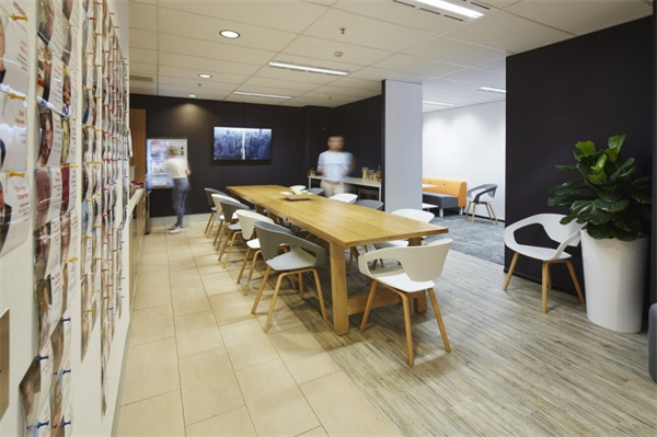 5、服裝公司辦公室裝修設(shè)計(jì):接待處位于底樓的正門,設(shè)有休息室和會(huì)議空間,可容納訪客。接待區(qū)周圍的定制墻板模仿了織物的褶皺,并為零售品牌的工作場(chǎng)所提供了設(shè)計(jì)敘事。提供各種團(tuán)體座位安排的所有團(tuán)隊(duì)成員的共用食堂位于地下室。開放式辦公室和休息區(qū)沿著面向公園一側(cè)的全高立面玻璃排列,使員工在工作期間可以欣賞郁郁蔥蔥的綠色美景。玻璃隔斷用于將會(huì)議室、私人櫥柜與開放辦公室分隔開來,充分利用自然光線,創(chuàng)造一個(gè)透明通風(fēng)的工作場(chǎng)所。白色、灰色和黑色的基本色調(diào)與天然的木材和石材表面作為重點(diǎn),為工作場(chǎng)所的創(chuàng)造性工作創(chuàng)造了一個(gè)干凈和舒適的背景。墻面紡織面板和天花板護(hù)罩可確保共享空間和封閉空間所需的聲學(xué)特性。