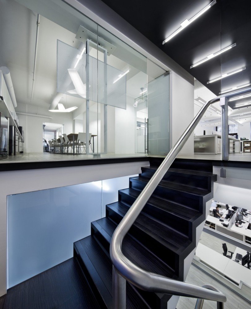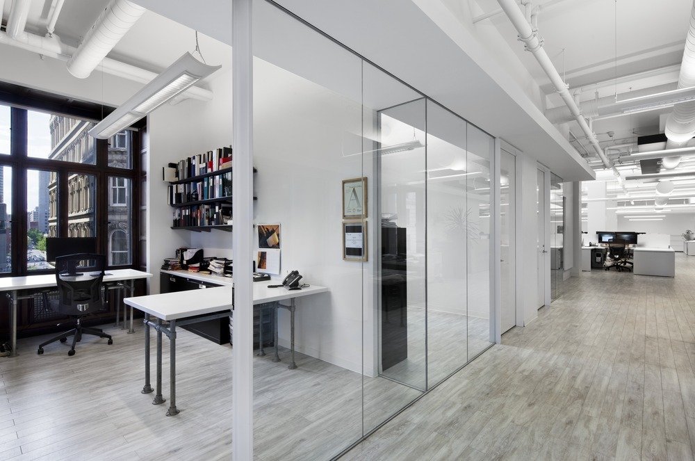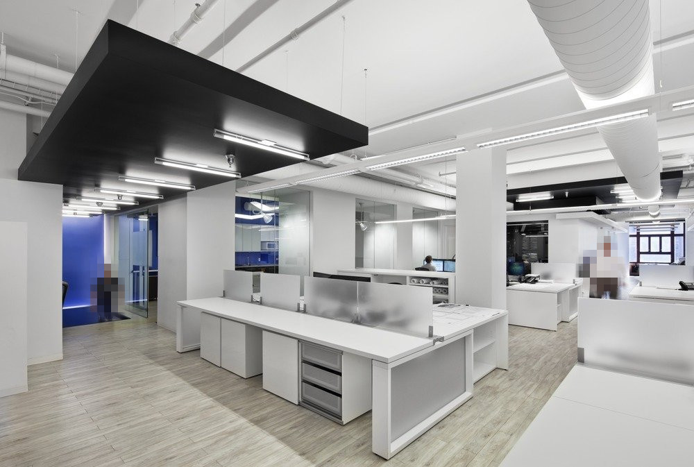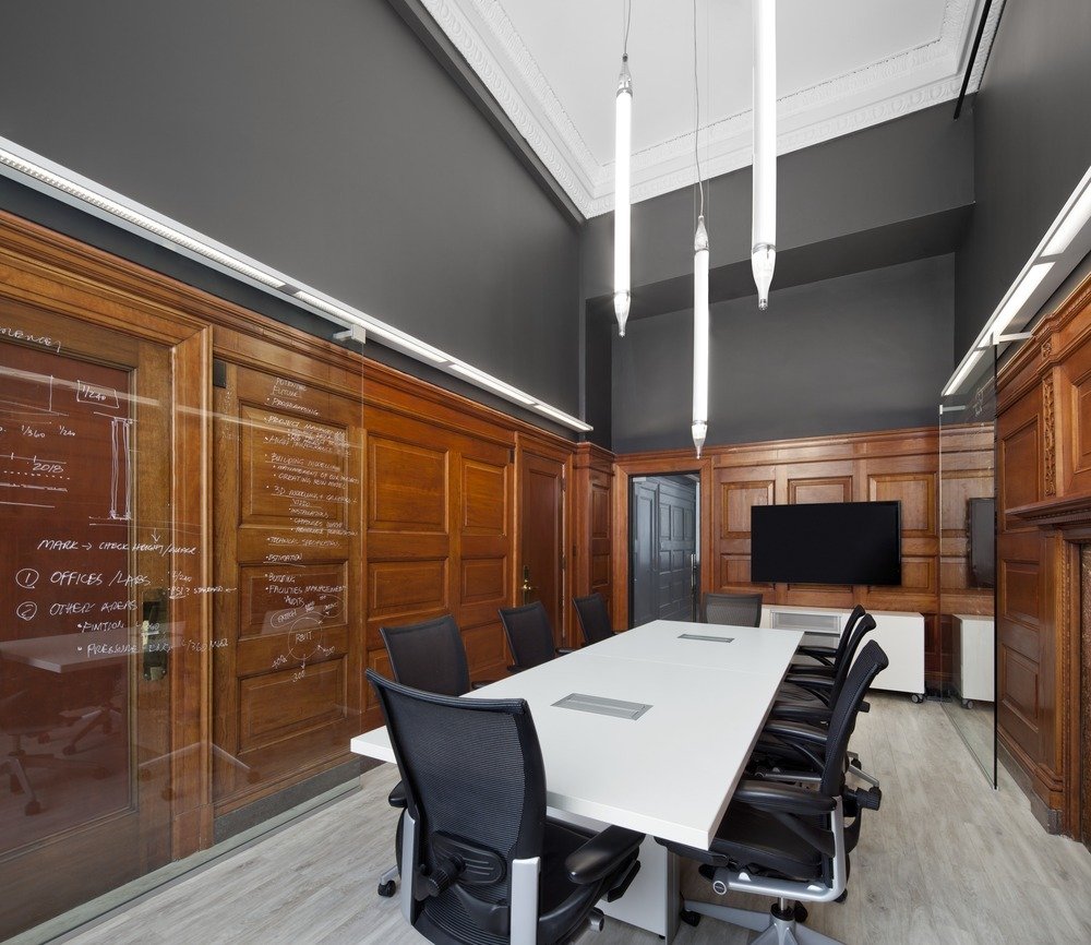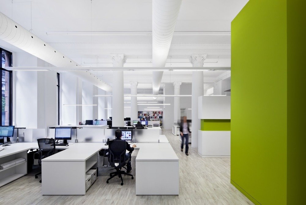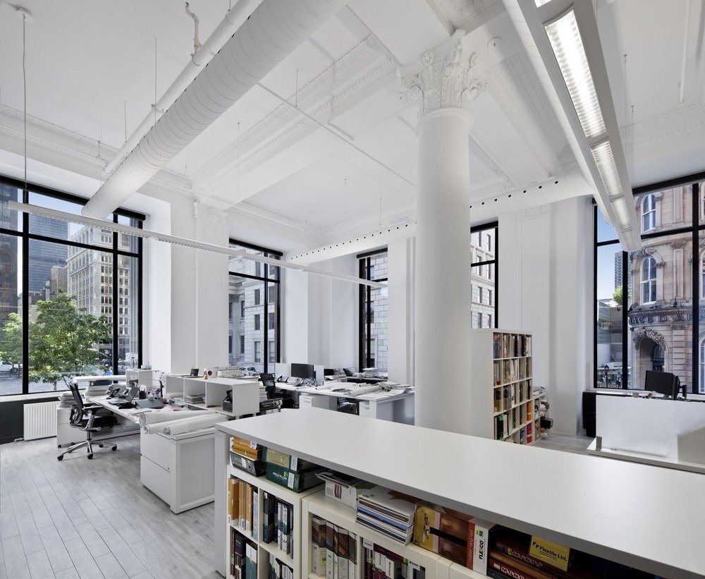 設(shè)計通過對橫向與豎向的空間微妙把握,傳達出將過去與現(xiàn)在結(jié)合在一起的建筑美學(xué)。室內(nèi)的改造清除之前翻修時增加的所有隔墻,以恢復(fù)空曠的建筑空間。室內(nèi)僅以優(yōu)雅的家具陳設(shè)來點綴建筑空間。空曠大廳內(nèi)的每個工位除了讓員工擁有獨立的工作空間更是為了促進組員間的工作交流,臨時會議區(qū)就近設(shè)在員工工位旁。整個樓面由開放空間組成,以此來強化建筑自身的結(jié)構(gòu)美感:華麗的柱式和頂面,裝飾線條與木飾面。銀行的金庫位于一樓,現(xiàn)用于圖書室。
