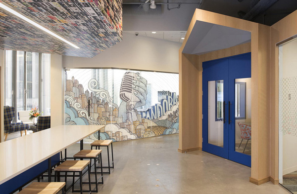 開放性的辦公區(qū),設(shè)計師使用餐廳質(zhì)感的訂制家具,取代以往的OA辦公家具,讓員工作業(yè)可以更加舒適愜意。設(shè)計師特別為業(yè)主規(guī)劃斜角天花及專業(yè)隔音系統(tǒng),讓每次聆聽音樂都是一場享受。