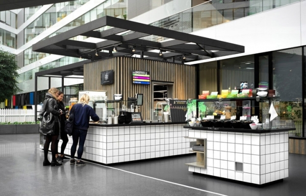 位于一樓的中庭主要是團隊協(xié)作共創(chuàng)區(qū)、休閑區(qū)和大型吧臺服務(wù)區(qū)三大功能區(qū)塊,結(jié)合生機盎然的綠化共同交織而成一個開放、活力、精彩紛呈的時尚辦公空間。