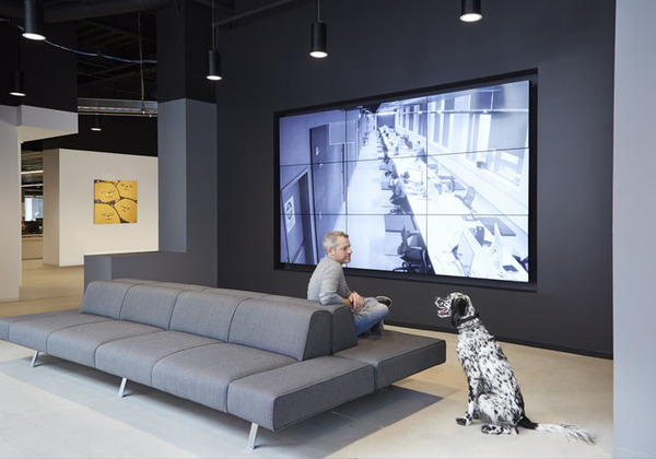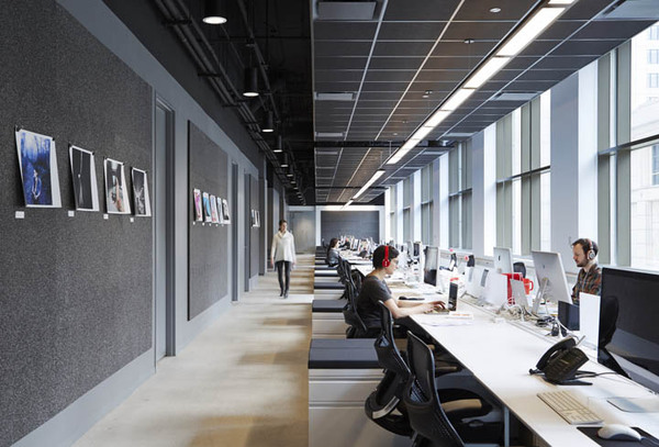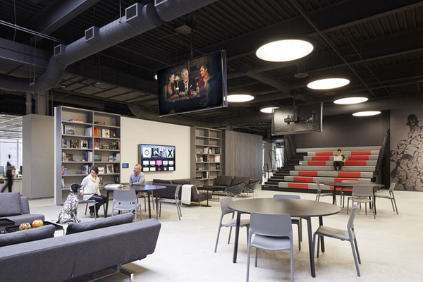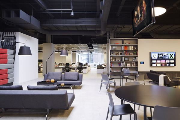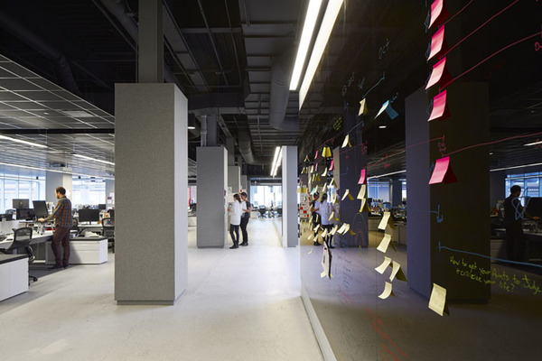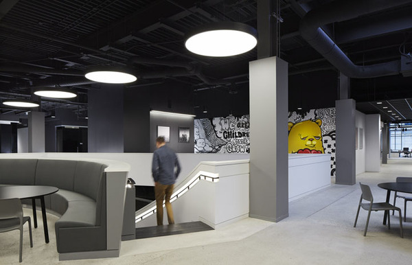 當然作為創(chuàng)意公司,這里還規(guī)劃了一處大型集會空間,用以全體員工的聚會等活動。各類創(chuàng)新座位區(qū),比如在大型集會區(qū)用作空間分隔的階梯看臺座椅等。室內的裝飾表面也具有多功能性,比如墻體和結構柱大量運用磁性玻璃、烤漆玻璃以及可黏貼或釘圖釘的材質,這樣可以隨時記錄創(chuàng)意構想。