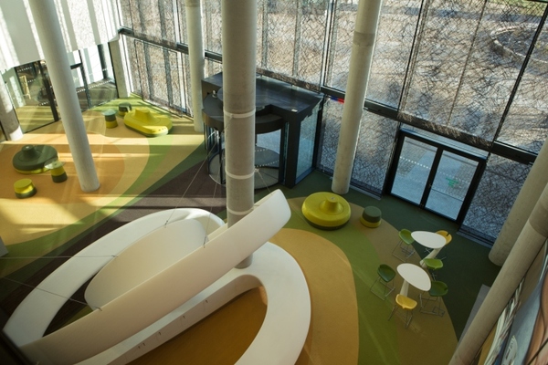 大廳和一樓之間的實體連接,是通過扶手電梯來完成的。大廳的南面采用玻璃幕墻,跟墻外的街道形成一種交互。中央那個形狀獨特的前臺接待桌,把大廳整個平面的布局規(guī)劃的像是一幅圖畫。設計師專門使用一些能夠給人帶來柔軟感覺的材料,比如人造的草皮,還有那些好像是生長在柱子和家具上的苔蘚和地衣。