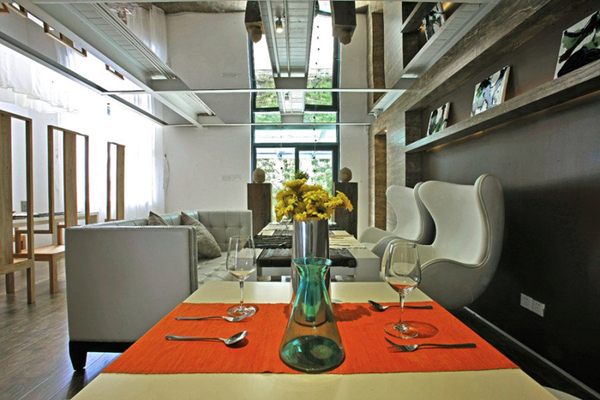 枯樹、鳥籠、白色鵝卵石、明代老家具等這些原生態(tài)的設(shè)計元素,在設(shè)計師筆下挖掘、整合運用,塑造了一個溫文爾雅的環(huán)境,在人性化上一樓兼做了一個可交流的小餐吧。