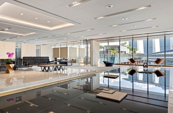 其辦公室裝修設(shè)計(jì)寧?kù)o優(yōu)美、夢(mèng)幻仙境、根植于亞洲的文化特征、精神文化的傳達(dá)、漂浮于水上的玻璃會(huì)議室、視覺體驗(yàn)。