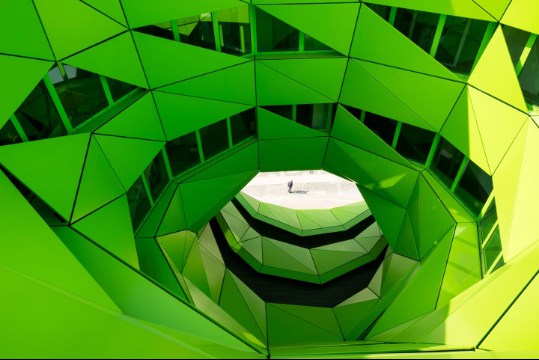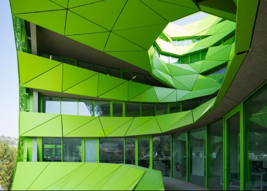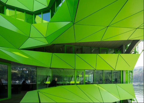近來,法國里昂海港區(qū)出現(xiàn)了一幢披著綠色外衣的大廈,它就是歐洲主流媒體之一的EuroNews新總部大樓。輕型的釉質幕墻,覆有不規(guī)則的多孔鋁制包層。來源于河水顏色的靈感,讓綠色滲透到了辦公室的“骨血”中。