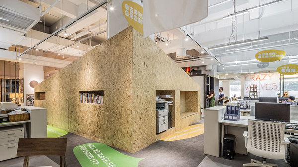 辦公區(qū)域的設計,設計師將奇思妙想融入空間,交流區(qū)域的背部被設計師開發(fā)出各式各樣的洞口,為的就是安置辦公設備,以此滿足辦公需求,真可謂是創(chuàng)意無限。