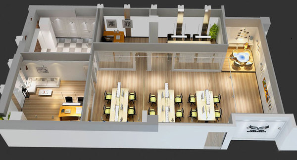 俯視圖:通過以上的俯視圖大家對于空間會有一個直觀的認識,企業(yè)品牌設計在外部墻面,經(jīng)過進門區(qū)域進入辦公室,首先經(jīng)過的就是形象墻,到達打印茶水區(qū)域,通過動線拐彎經(jīng)過開放式辦公區(qū)域與會議室、副經(jīng)理辦公室,**到達總經(jīng)理辦公室與拍攝區(qū)域。