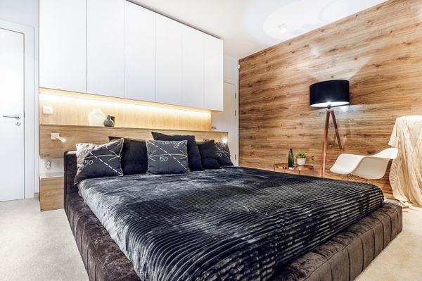 二樓為屋主的私人區(qū)域,以符合整體理念的木元素奠定了溫暖、柔和的睡眠環(huán)境,深色天鵝絨的雙人床華麗又現(xiàn)代,利用床頭背景柜滿足臥室的儲(chǔ)物需求。