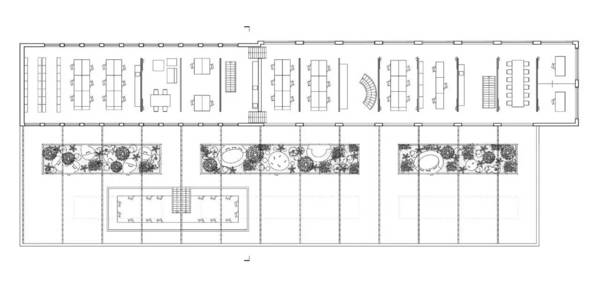 綠植陽光房的一側(cè)為提供休息座椅的雙層空間,中心區(qū)域的白色體塊包含了一個衛(wèi)生間與大理石臺面的咖啡間。陽光房的另一側(cè)為兩層辦公空間,通過旋轉(zhuǎn)樓梯連接。同時,建筑立面上增加了一排大窗戶,以擴大從街道到辦公室內(nèi)的視野。