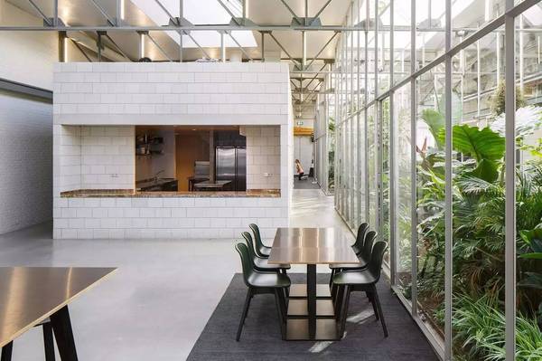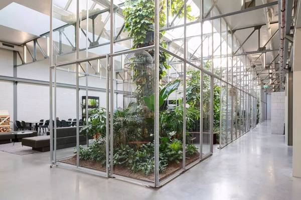 由荷蘭Space Encounters工作室為設(shè)計和制造人體工程學(xué)童車的Joolz公司,剛剛完成了位于阿姆斯特丹北部的一個1600㎡的辦公樓改造。這座玻璃屋原來作為舊倉庫,設(shè)計者首先去除底層室內(nèi)的所有墻體,利用高聳的種滿植物的玻璃屋將整個空間分成兩個長廊似的辦公室,玻璃屋一直連到屋頂,與天窗結(jié)合在一起。