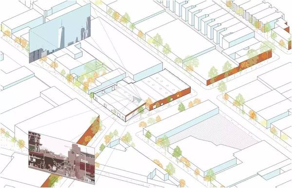 這樣的設(shè)計手法,給予室內(nèi)空間相互關(guān)聯(lián)。同時,設(shè)計者還對建筑入口進行了從視覺化的處理,移除面向西南角的三角形的區(qū)域,改為透明的立面,將被涂鴉的磚墻重新組裝,以制造出不同的涂鴉樣式,以此表現(xiàn)建筑以及社區(qū)間層層疊加以及穿插的歷史。