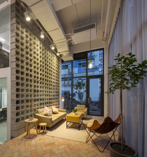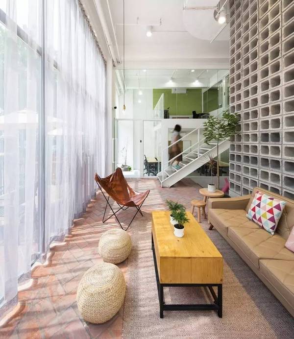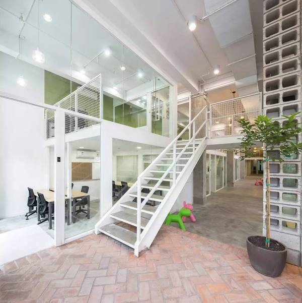 由一十一建筑改造設(shè)計的位于深圳的一棟聯(lián)合辦公空間,建筑由一棟工業(yè)建筑的首層一部分改造而來。由于室內(nèi)具有很高的天花,在確保自然光線能達到場地較深區(qū)域的前提下,設(shè)計者在局部區(qū)域設(shè)計了夾層。利用天花的高度,創(chuàng)造出更多的變化形式。同時,利用一系列戶外建筑材料使用在室內(nèi)空間,作為重要公共區(qū)域的特色景觀墻,紅磚在室內(nèi)于室外的連續(xù)鋪設(shè),以模糊室內(nèi)外邊界和處理高差。