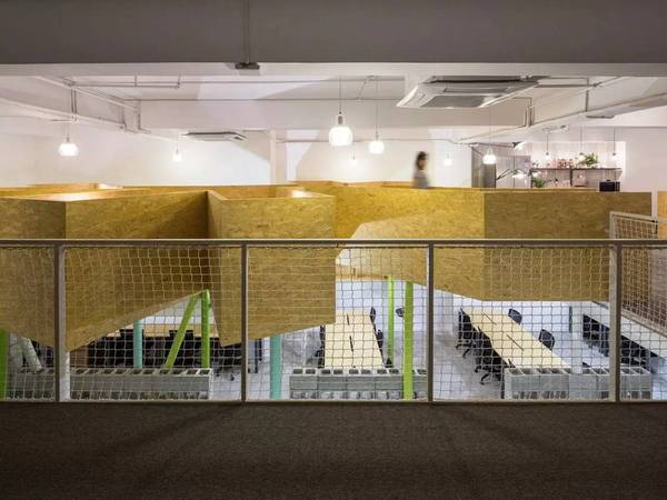 建筑**特點的是由鐵架搭建外包歐松板,并由一些鐵的支柱承托抬升到夾層的高度的“云座”休閑吧,其擺脫室內(nèi)透視主導(dǎo)的造型,以及隱藏結(jié)構(gòu)之后整體的漂浮感,為室內(nèi)創(chuàng)造了一個脫離工作取得休閑環(huán)境。