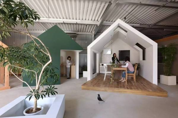 由ALTS Design Office設(shè)計的位于日本滋賀縣的Omihachiman新工作室,業(yè)主希望可以滿足不同的群體使用,同時尋找一個能夠令他們自由談話的工作室。設(shè)計者為室內(nèi)創(chuàng)建了四種“房子形狀”的位置,通過不同尺度的模塊形狀,適應(yīng)不同人群的社交空間。