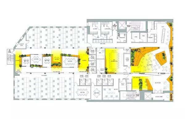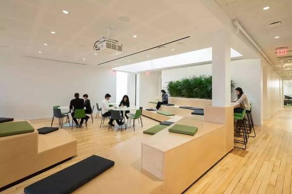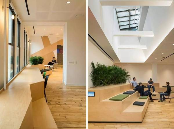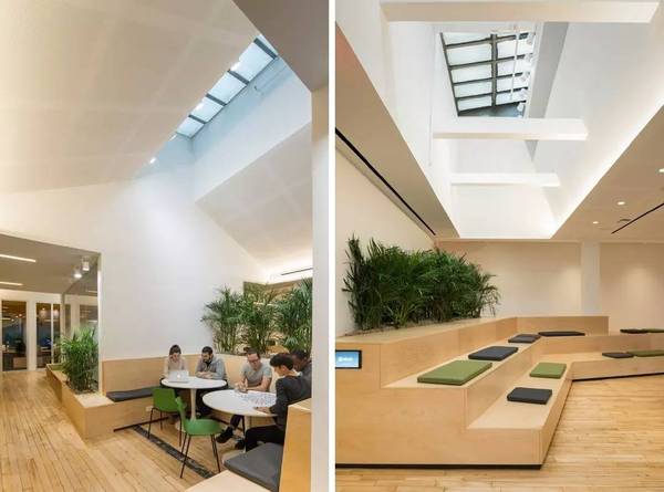 Sn?hetta對Slack新紐約空間設(shè)計(jì)的靈感來源于**特色的城市小院。從Paley Park的室內(nèi)景觀中吸取靈感,竹植物提供自然的隱私屏幕,并為綠化帶來空間。現(xiàn)有四個(gè)天窗與放大,八字天花板大大增加了室內(nèi)以及內(nèi)部小庭院的自然光線。