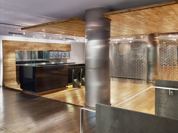 不同于其他各種材質(zhì)、各種類型的屏風(fēng)和隔斷,設(shè)計師選用鋁網(wǎng)篩孔這一特殊的建筑材料將吧臺與開放式工作區(qū)巧妙分隔。