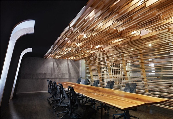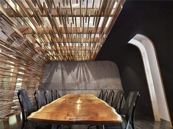 會議室的墻面由毛氈與黑板以及落葉松木條板組成,無序的條板構(gòu)造像是牛身體內(nèi)的經(jīng)脈??臻g結(jié)構(gòu)如同一艘小船或原始人居住的棚屋。