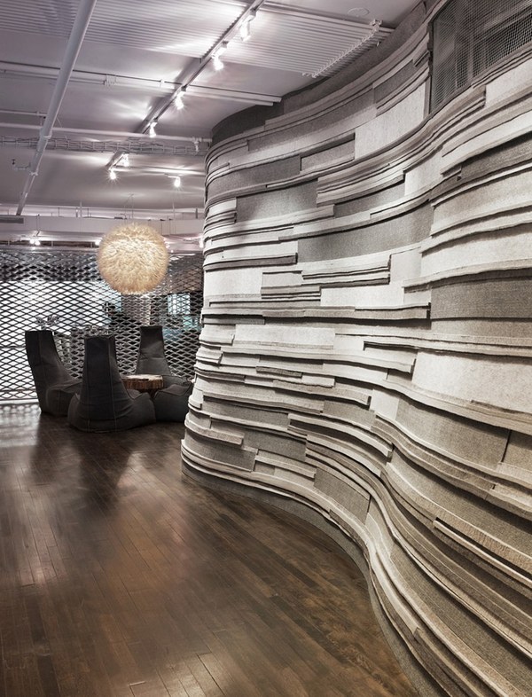 設(shè)計圍繞四個空間主題:休閑吧、線形開放式辦公位、羊毛氈飾面的空間結(jié)構(gòu)體、以及大會議室。場所不僅適用于辦公需求,還兼有多重功能,如舉辦各種派對、發(fā)布會、開幕式、以及招待會等,因此休閑吧成為空間的重中之重。