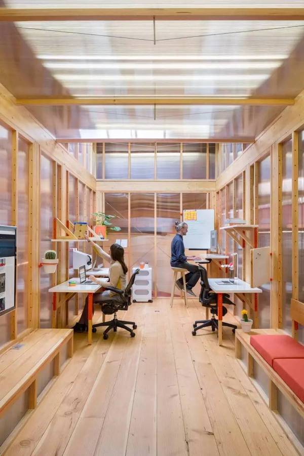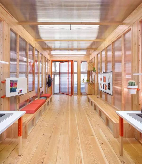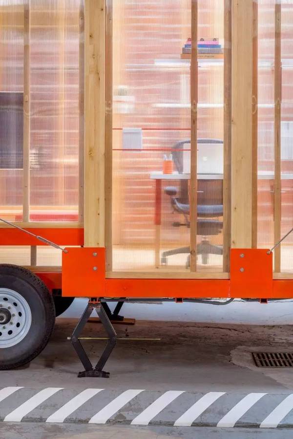 設(shè)計師保留了拖車的后梁結(jié)構(gòu),使用聚碳酸酯面板作為整個辦公室的墻壁。這種材質(zhì)的面板允許大量光線填充空間,同時也能吸收一些自然光,使得室內(nèi)光線不那么刺眼。設(shè)計師用從本地采購的道格拉斯冷杉木來與半透明的墻壁搭配。 此外,他們還大膽的采用紅色以及其它鮮艷的顏色來活躍氣氛。
