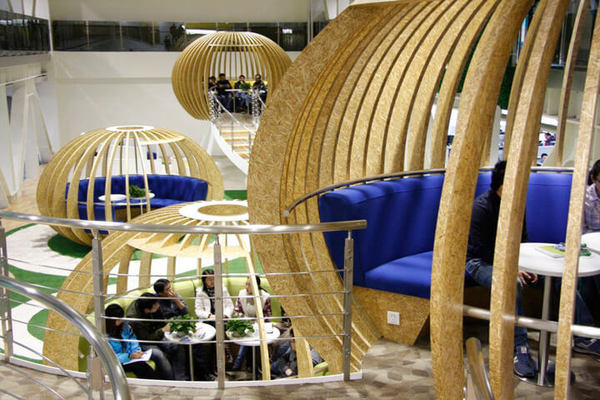 而關(guān)于大家**奇的,除了它本身的膠囊造型之外,就是這些“鳥籠”的材質(zhì)了;這些坐落于竹木地板上的“未來對(duì)撞機(jī)”,用麥秸板——一種可再生的農(nóng)業(yè)材料,秉承可持續(xù)發(fā)展的健康辦公環(huán)境的創(chuàng)新理念,這也是在2010年上海世博會(huì)展館使用的主要材料。100%優(yōu)質(zhì)原材料的麥秸板,采用無甲醛膠粘劑(P-MDI)通過熱壓工藝低碳、環(huán)保、健康。因?yàn)槭恰傲隳尽辈牧?,還有助于減少森林砍伐,這反過來又進(jìn)一步的積極影響我們呼吸的空氣質(zhì)量??偠灾@樣的辦公室裝修設(shè)計(jì)無論是在環(huán)保上還是實(shí)用上都給我們做出了很好的表率。