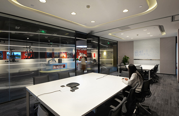上海領(lǐng)企創(chuàng)裝飾公司分享的這套網(wǎng)絡(luò)科技辦公室裝修設(shè)計(jì)圖中,辦公室前臺(tái)及展廳的設(shè)計(jì)采用了弧形墻體,墻體上的弧形燈帶、天花上的吊燈以及不同顏色地毯拼接而產(chǎn)生曲線元素貫穿整個(gè)展廳空間,帶來極強(qiáng)的視覺延伸感。配合了VR等互動(dòng)體驗(yàn)裝置,以及實(shí)體產(chǎn)品,為訪客帶來富有科技感的體驗(yàn)感受。提高空間的功能性和使用效率,大會(huì)議室可以在需要的時(shí)候由移動(dòng)隔斷分割為兩個(gè)獨(dú)立的會(huì)議室使用。下面領(lǐng)企設(shè)計(jì)創(chuàng)裝飾公司小編帶大家看一下1200科技公司辦公室裝修案例!