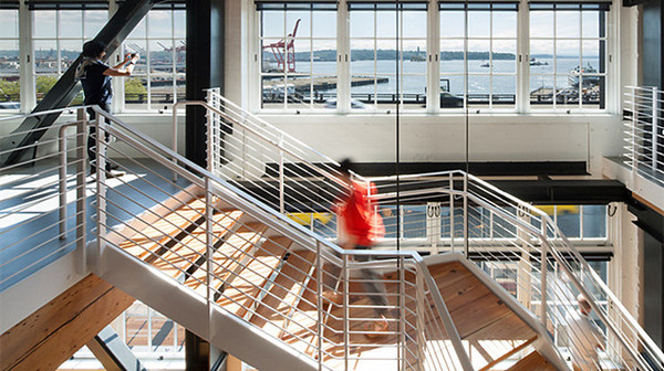 設(shè)計(jì)師用新的鋼結(jié)構(gòu)與再生木制成樓梯,連接上下樓,開(kāi)放式的辦公室設(shè)計(jì)在這一基礎(chǔ)上再次放大,這種辦公室是非常利于交流的,比起封閉的辦公室,我們更能感受到團(tuán)隊(duì)氣氛。