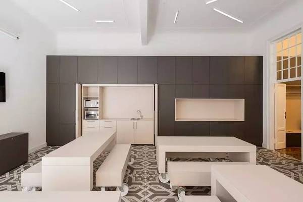 辦公空間分成了兩個(gè)不同的部分,一個(gè)是公共區(qū)域,一個(gè)是辦公區(qū)域。辦公室一層里設(shè)計(jì)布局有接待處,以及多功能區(qū),休息室的入口處就是前臺(tái),自助餐廳內(nèi)隱藏的廚房和木質(zhì)的滑輪座椅可以根據(jù)一天的需求而作相應(yīng)的變動(dòng)。二層則是設(shè)計(jì)規(guī)劃了一個(gè)大的開放區(qū)、會(huì)議室,以及私人辦公室,還有交互錯(cuò)落的咖啡間、電話亭等公共區(qū)域。