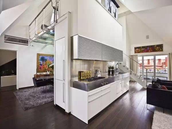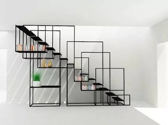 木質(zhì)或鐵藝懸浮樓梯在這個沉悶的空間成為了一個活潑的設(shè)計元素。