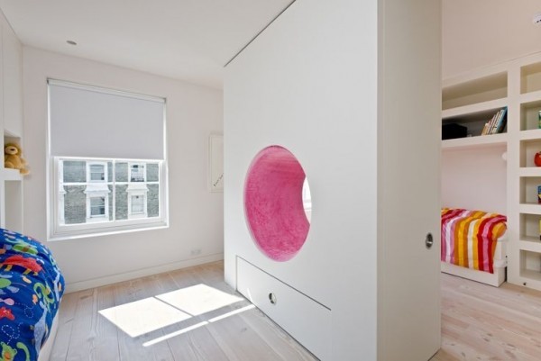 上面的是收納柜,也是隔斷,它們共處一室。粉紅色隧道,避免了厚重的墻壁帶來的壓抑感給空間創(chuàng)造更多的樂趣。
