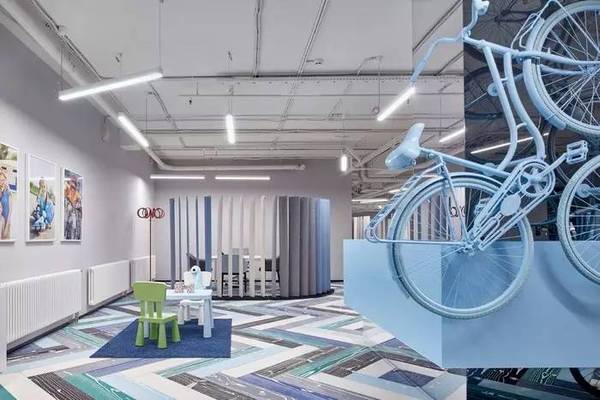 這種梯級的色彩配比猶如美麗的風(fēng)景畫一般令人賞心悅目,也再次點明本案的設(shè)計主題:運動、青春、以及浪漫主義的藝術(shù)情懷。接待臺旁邊那一組粉藍(lán)色自行車藝術(shù)裝置再次強(qiáng)化了這個設(shè)計主題。接待區(qū)的多元混搭組合設(shè)計,也在向大家傳遞這是一個多功能綜合型的辦公室屬性。
