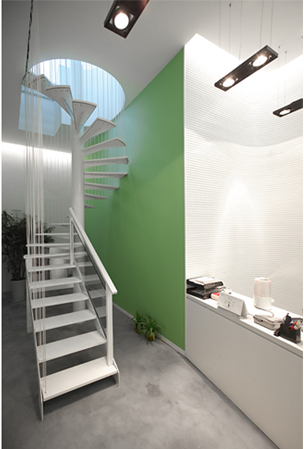 裝修的色彩并不是多種顏色搭配呈繽紛靚麗的景象,而是簡單的青綠色為主題,經(jīng)典黑白色輔助映襯。綠色的裝修裝飾給人青春活力的感覺,用在這里再合適不過了。其次是樓梯的造型設計,圓形旋轉樓梯,造型上的別致同樣也帶來了異樣的體驗。