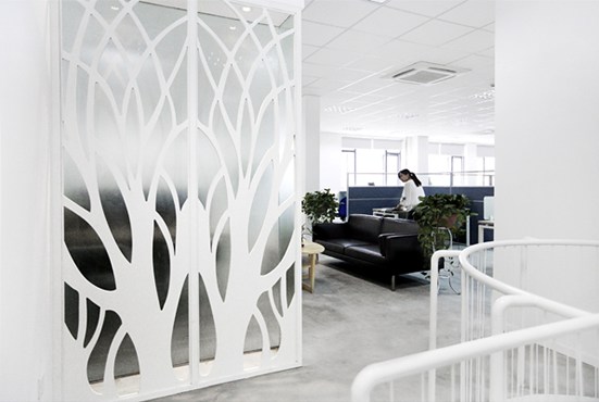 辦公室裝修的屏風設計不僅僅是處于玄關的作用而設置,也有著很大的裝飾作用。鏤空的樹形結構造型設計,一層模糊的鋼化玻璃,隔絕視線的同時,也營造了一個朦朧而富有趣味性的室內空間。
