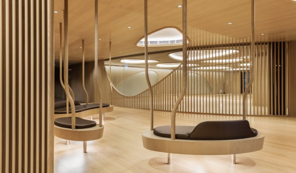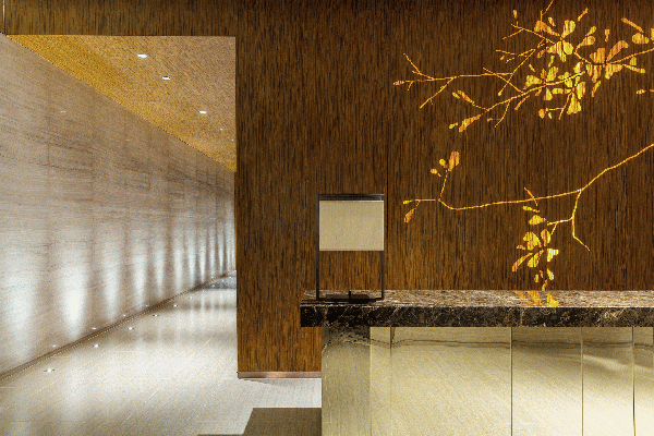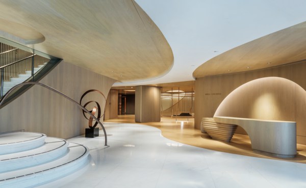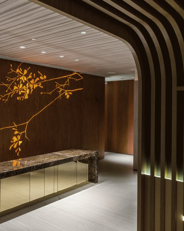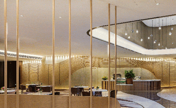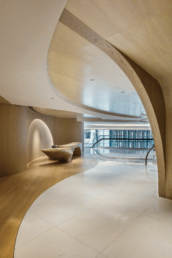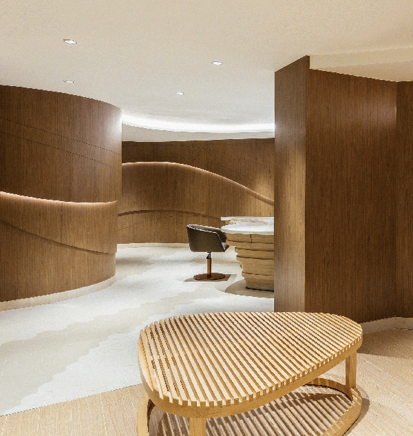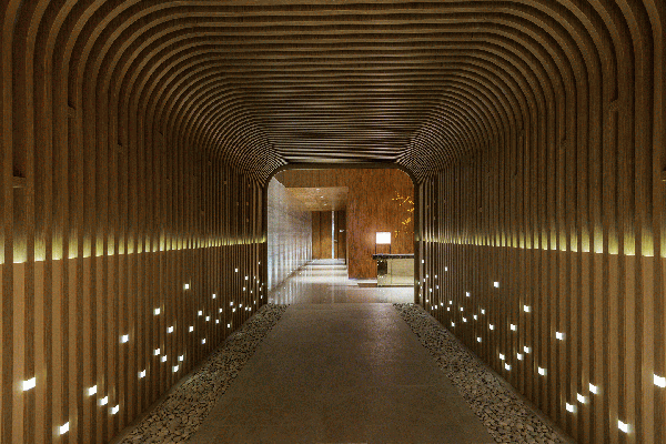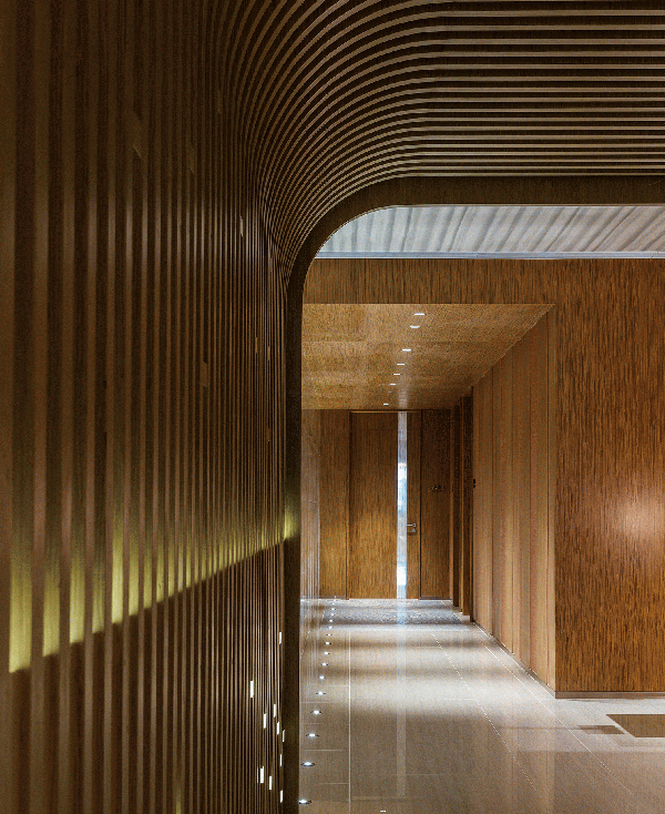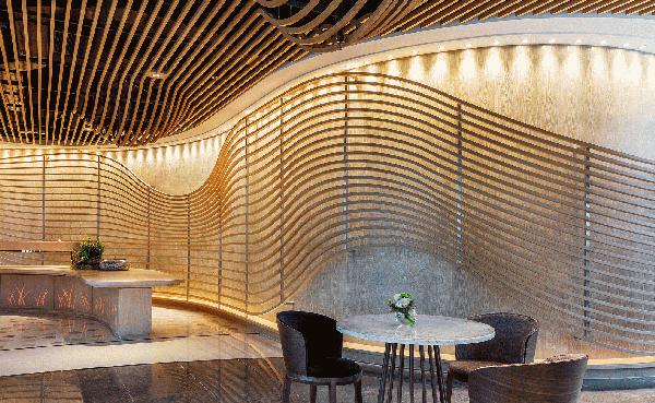 會(huì)所內(nèi)的木材不僅僅是結(jié)構(gòu)性的支持,起伏有致的輪廓?jiǎng)澐殖霾煌瑓^(qū)域,優(yōu)雅的弧線跨越寬敞的空間與柔和的燈光產(chǎn)生巧妙的相互作用。豐富的線條增強(qiáng)空間的立體感而不失悠閑的舒適享受,精妙的雕塑元素糅合簡(jiǎn)約的燈光折射及滲光燈槽,整體干凈利落,構(gòu)筑出精美雅意而富藝術(shù)感的視覺(jué)效果,凸顯設(shè)計(jì)師細(xì)膩的設(shè)計(jì)考量。