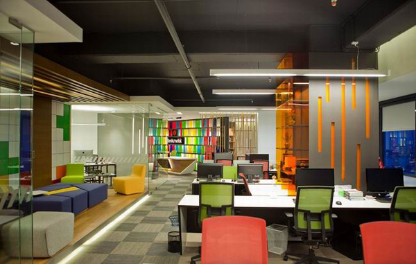 辦公區(qū)域的設計更有特點,天花設計成網狀造型,線條感特出,天花吊頂由兩種色彩不規(guī)則的幾何體組成,設計師把它們合理排列,表現(xiàn)出滿滿的藝術氣息。設計師辦公桌顏色搭配也十分新穎,風格與主色調統(tǒng)一,也選用彩色搭配,顛覆了以往單調的純色系列,這個創(chuàng)新十分大膽,創(chuàng)意無限。整個空間的設計用天花的蘋果綠和多彩的墻身色調,使整個辦公區(qū)表現(xiàn)出輕松、愉快的感覺。