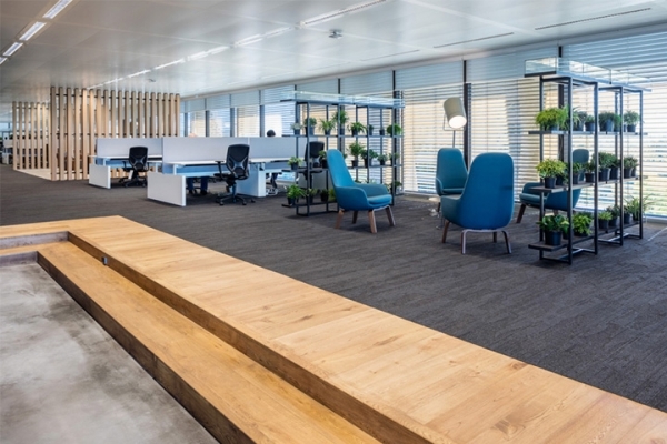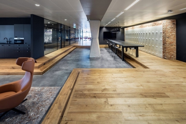 高低錯落的地面豐富了空間形態(tài)。溫暖的木色、混凝土地面、暗色系墻面和家具,簡潔的材質(zhì)對比卻營造出豐富的視覺效果和時尚辦公空間。開放辦公區(qū)沿窗而設(shè),遠(yuǎn)處蔥蘢美景盡收眼底。