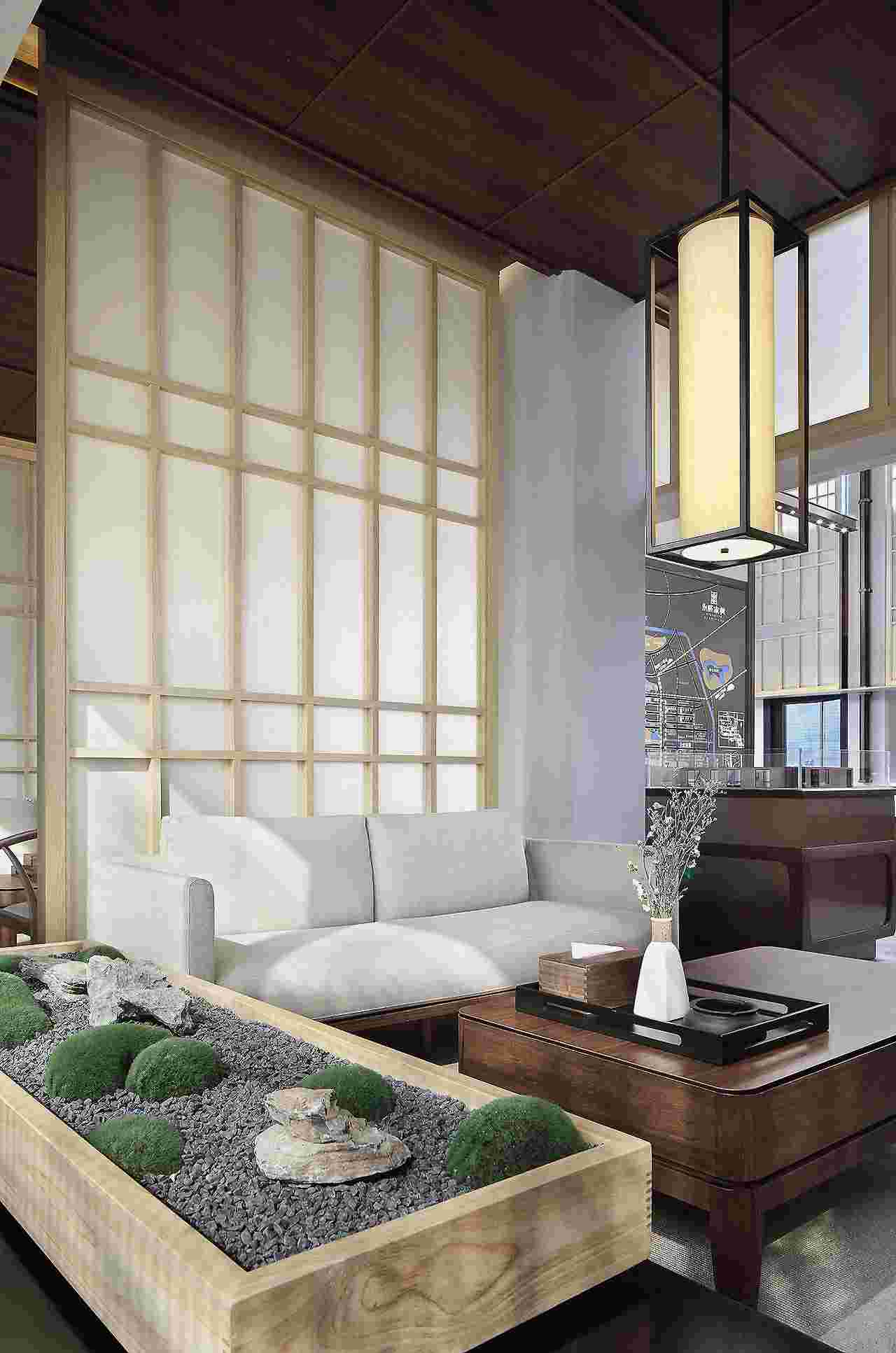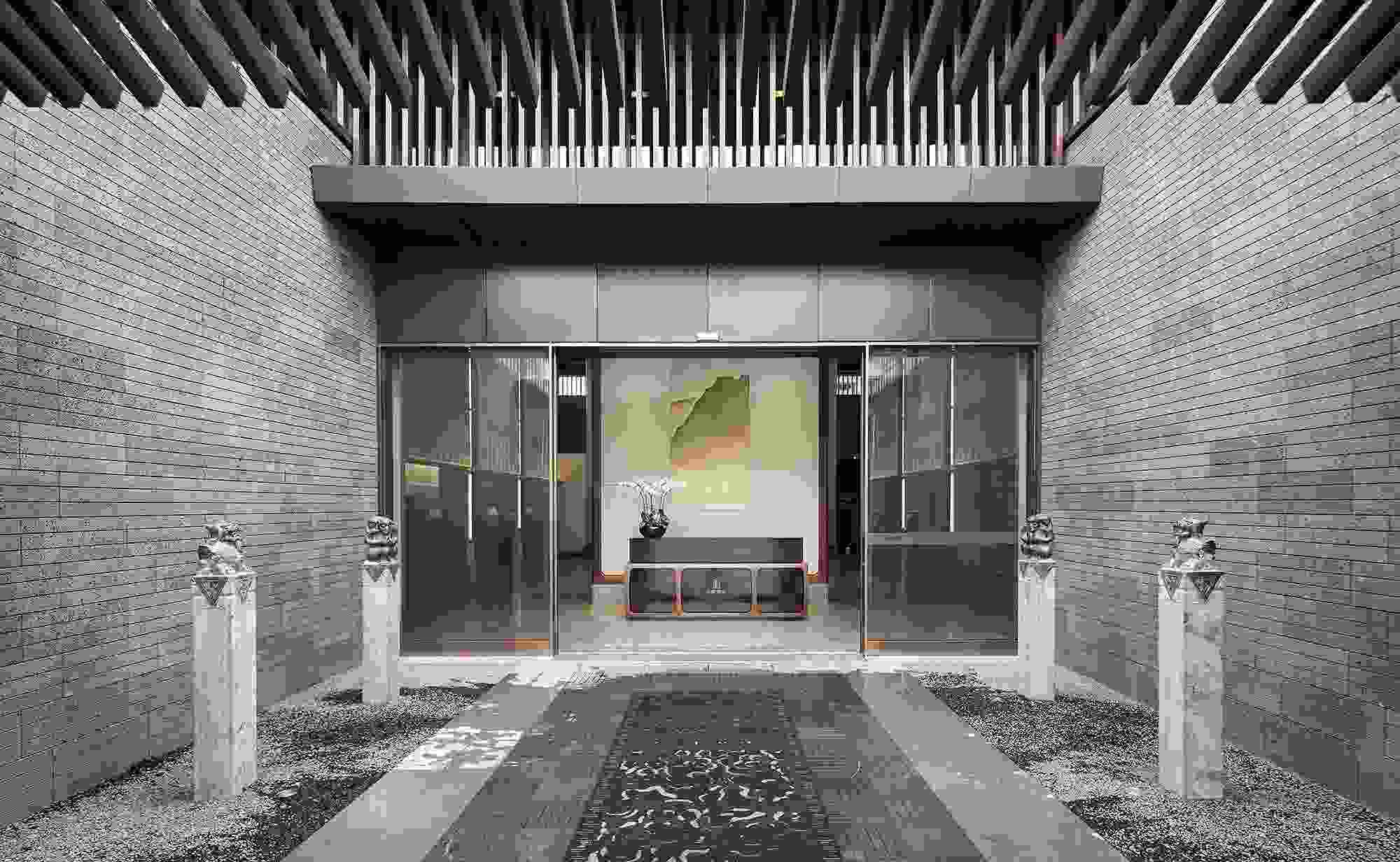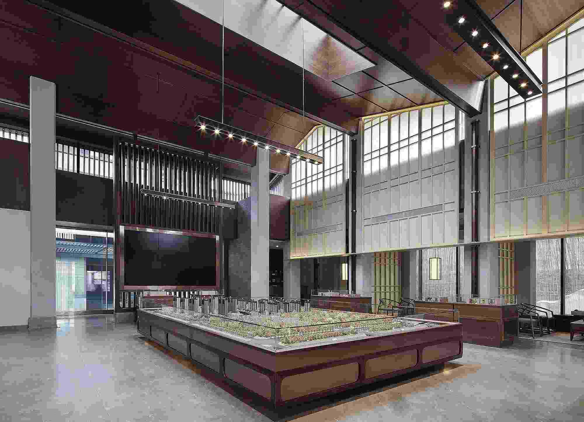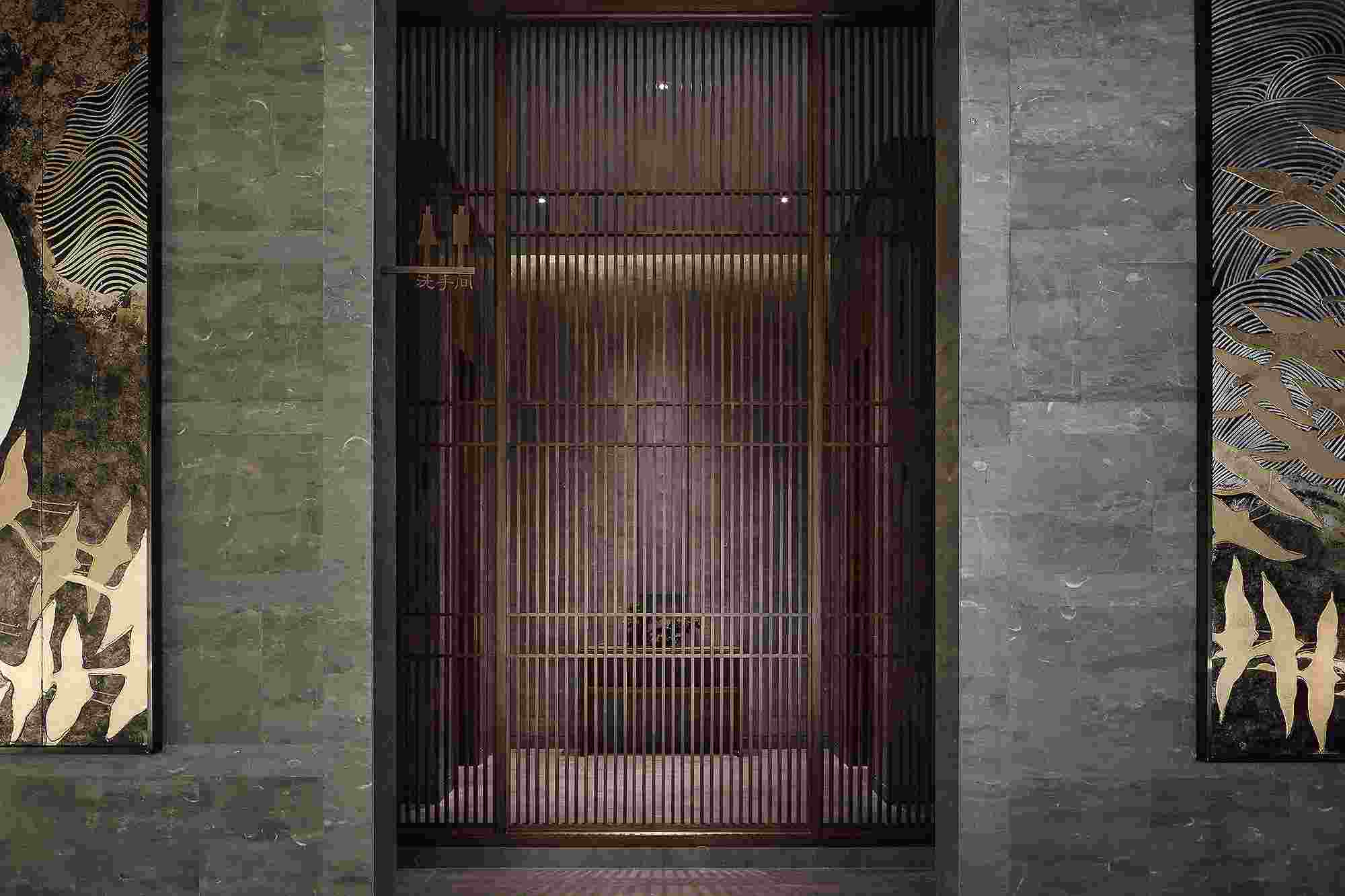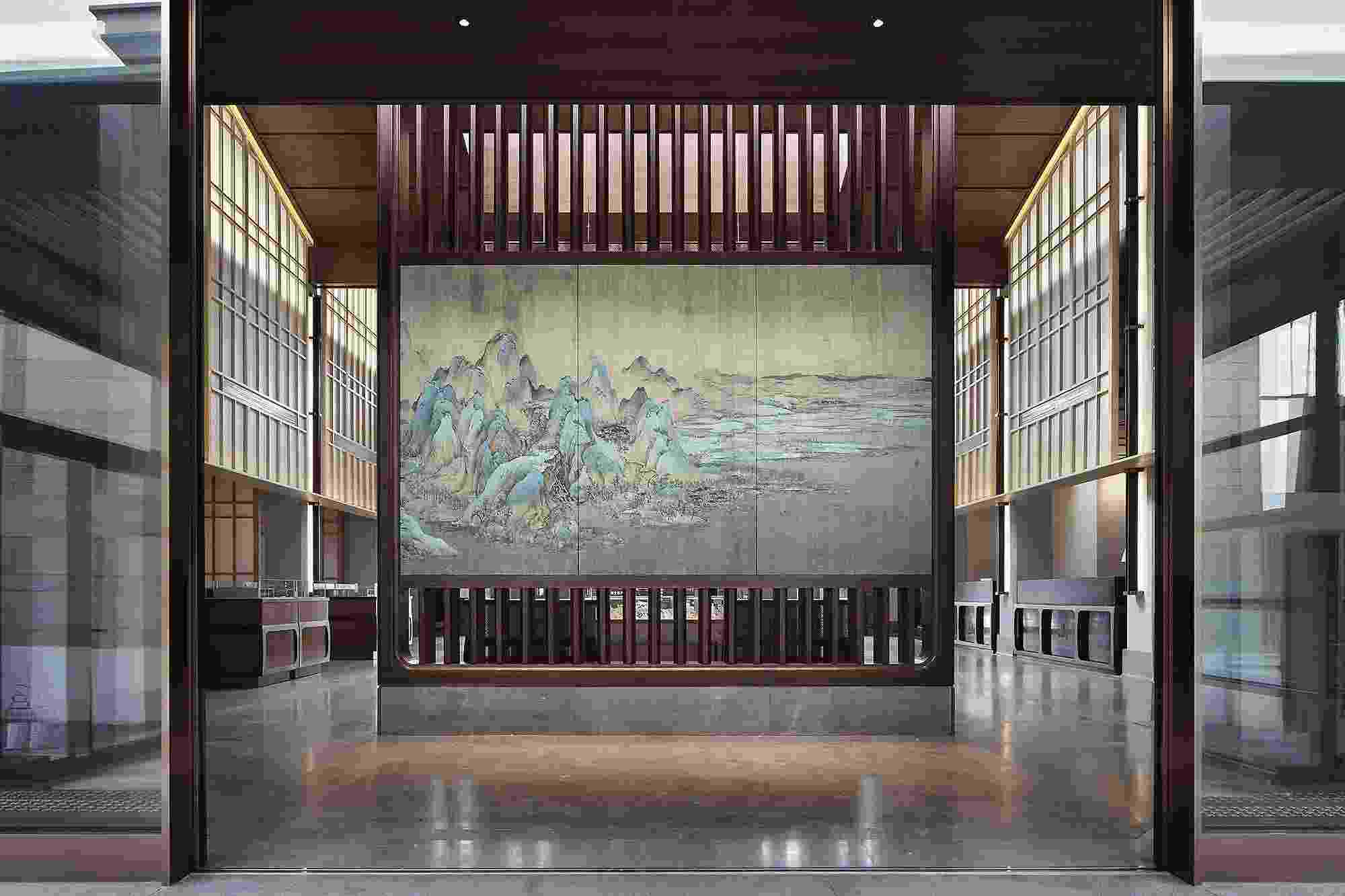 大廳內(nèi)高聳起伏的木質(zhì)屋頂結(jié)構(gòu)秩序井然,天井凌空處,將室外自在的光亮拽入屋內(nèi),吐故納新,渾然天成;天地相銜接的另一端側(cè)則是有序且虛實相間的木質(zhì)隔斷,山巒起伏的中式重彩畫屏斷與原先的照壁墻呼應(yīng),自是相得益彰,正應(yīng)了“淡妝濃抹總相宜”的寓意。