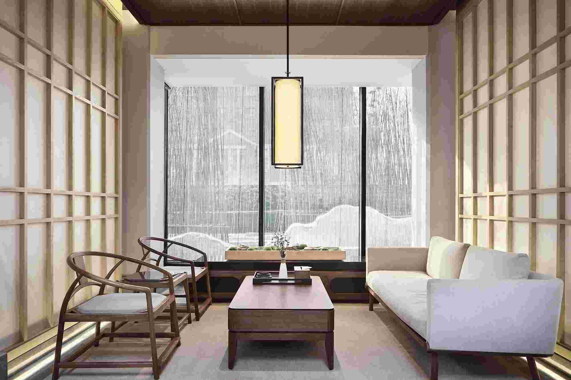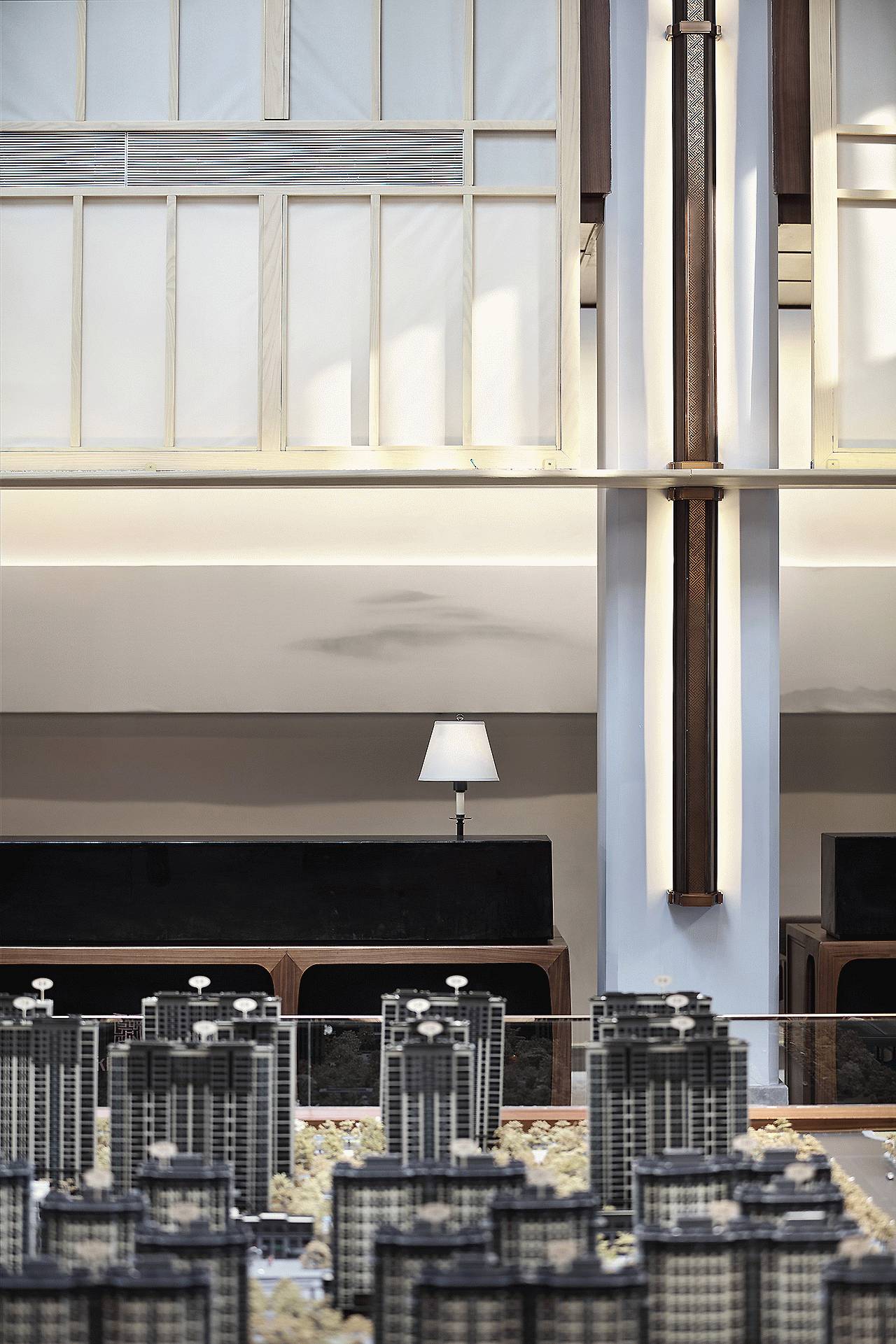 臨窗一側(cè),空間切分成若干會客區(qū),靜靜懸掛的方燈下,線條舒展的中式明椅明幾與素色沙發(fā)相對而列,輕輕的訴說著什么。