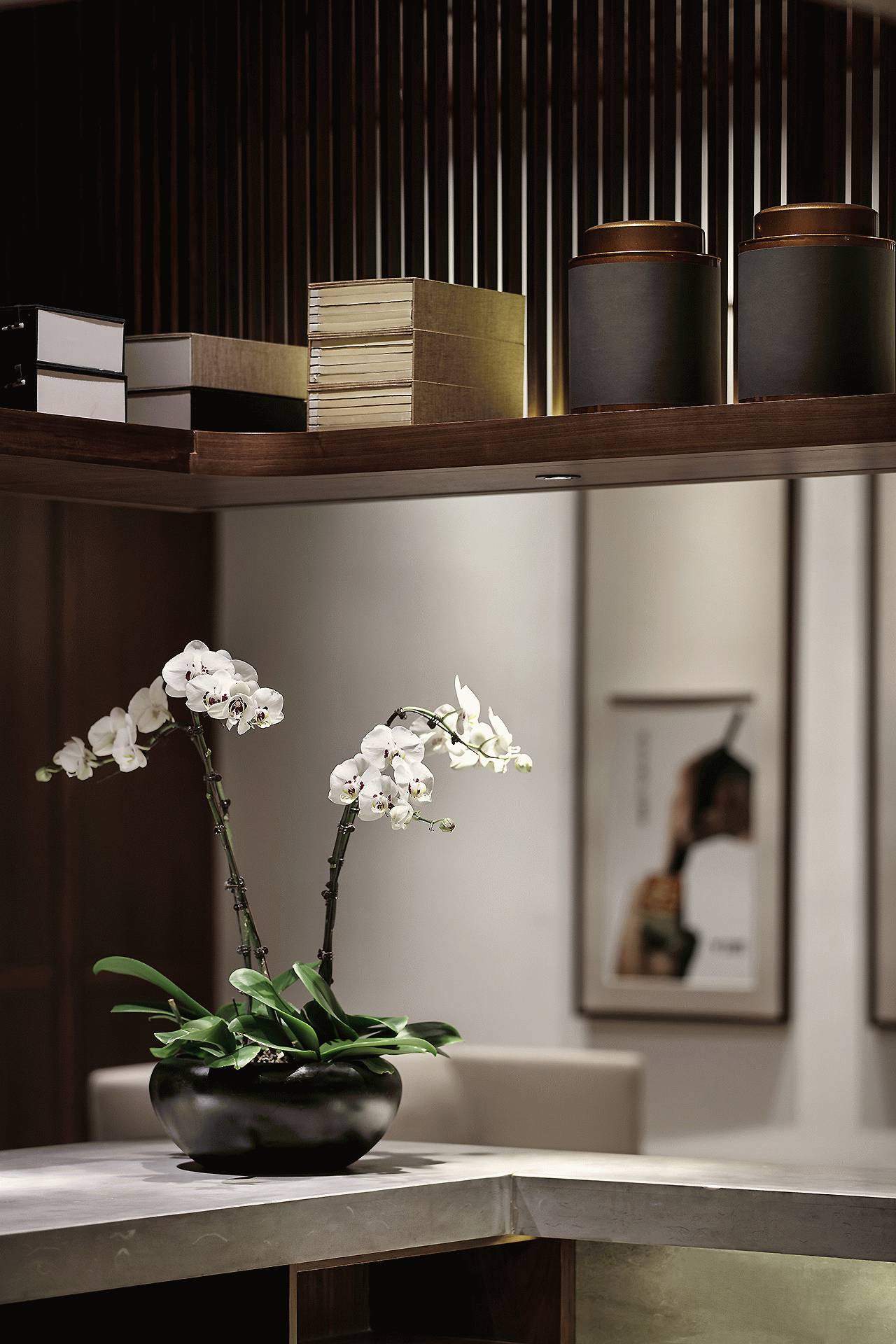 迎賓臺正中端坐,臺上一蔟婷婷如素白蘭形同翩翩君子一般佇立,襯在一副同樣素面朝天,拔地而起的中式淡彩畫墻前,誰能說得清熟是畫中物,熟又是畫外音?此端景恰似中式建筑空間傳統(tǒng)意義上“照壁”的韻味,室內(nèi)景象在它的遮擋下則若隱若現(xiàn)。