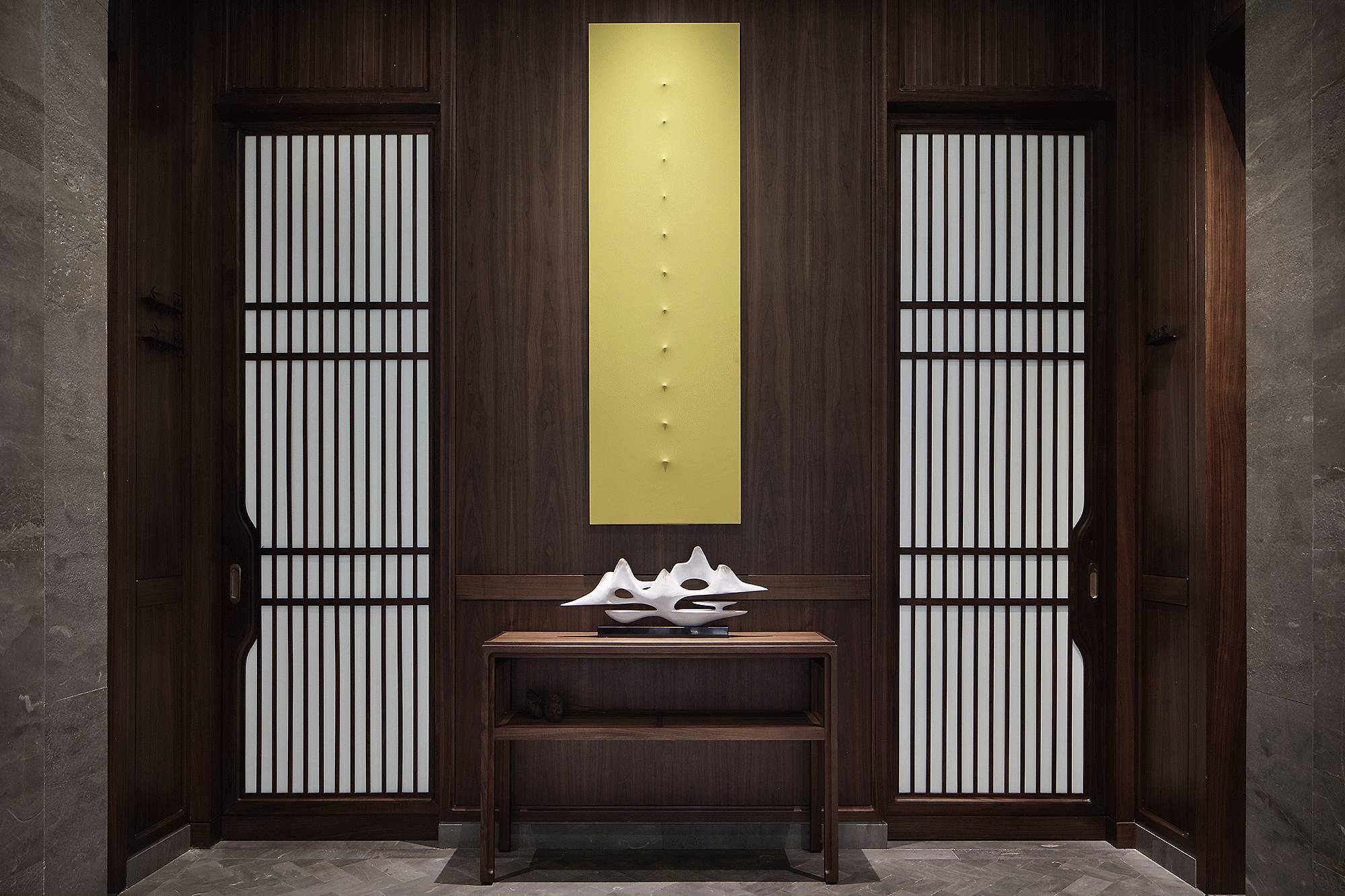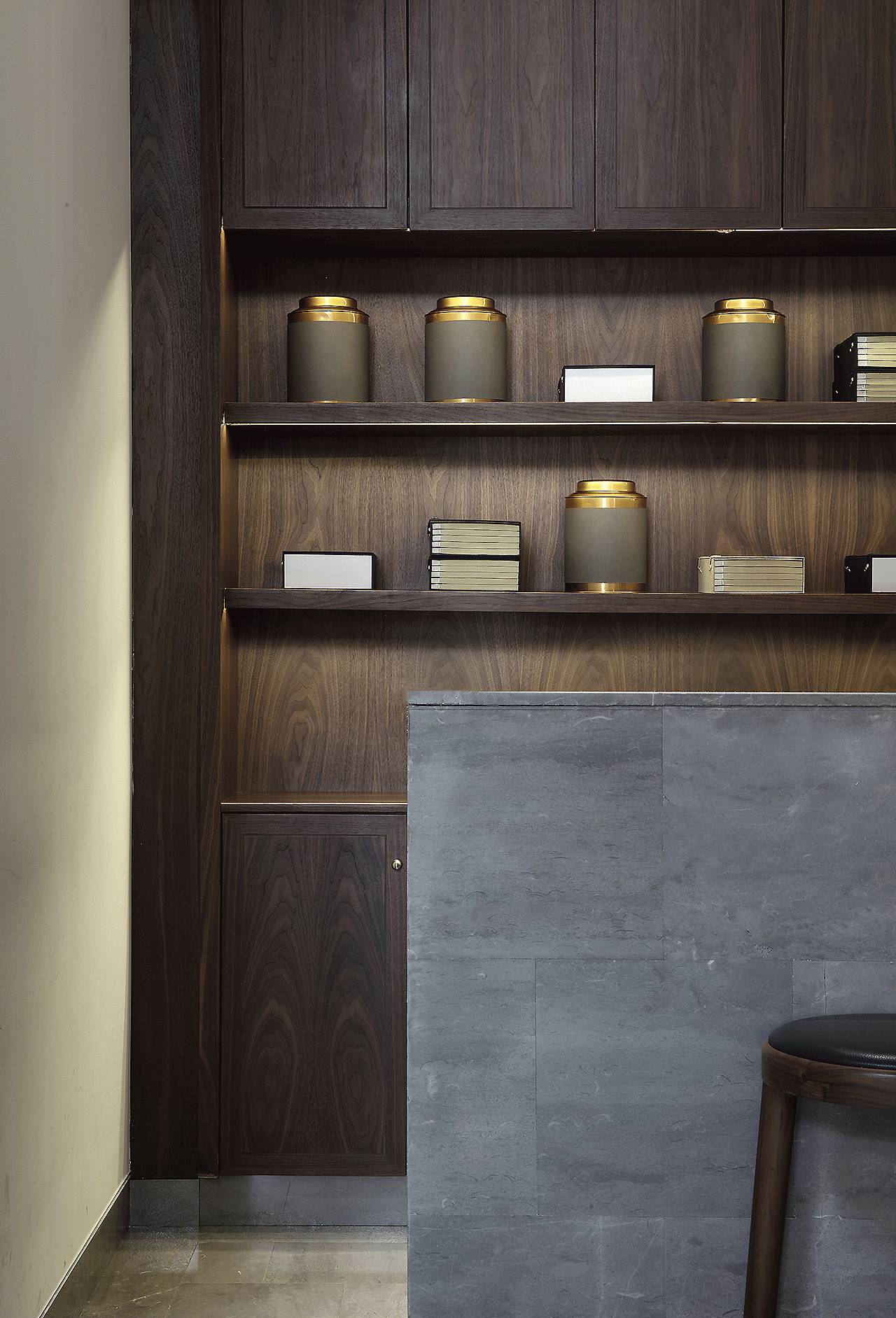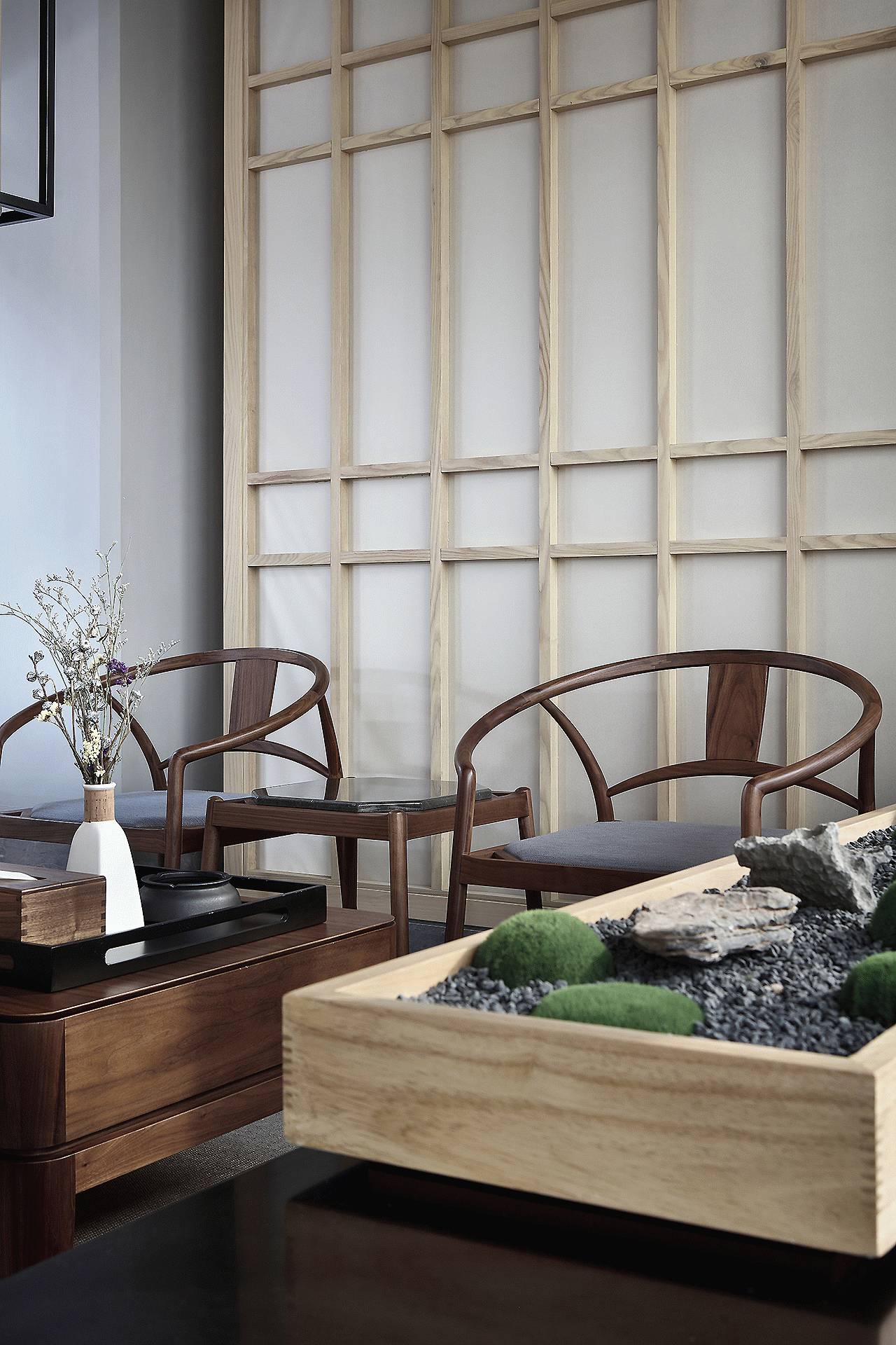 空間主體青灰色系打底,一重一輕兩種木色經(jīng)緯分明的鋪陳于其中,因重復(fù)而形成的序列感讓空間肅然而理性;過道墻面,水池上方,一行金羽鶴正翱翔于海天之間,自得其樂;而過道盡頭,一把椅,一張臺,墻上杏花枝頭鸚鵡獨自嘻戲,空間主旨的待客之道信手拈來。
