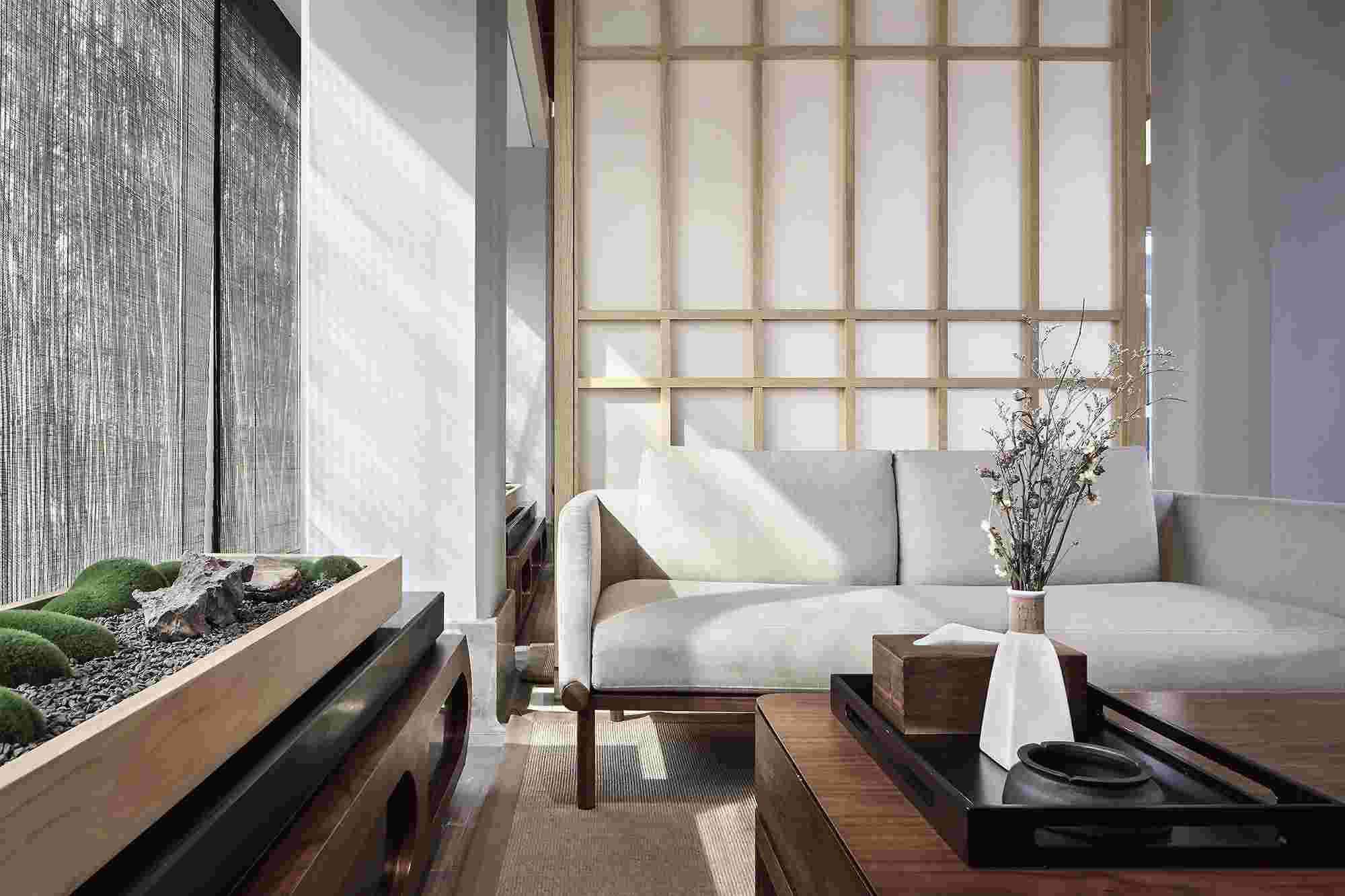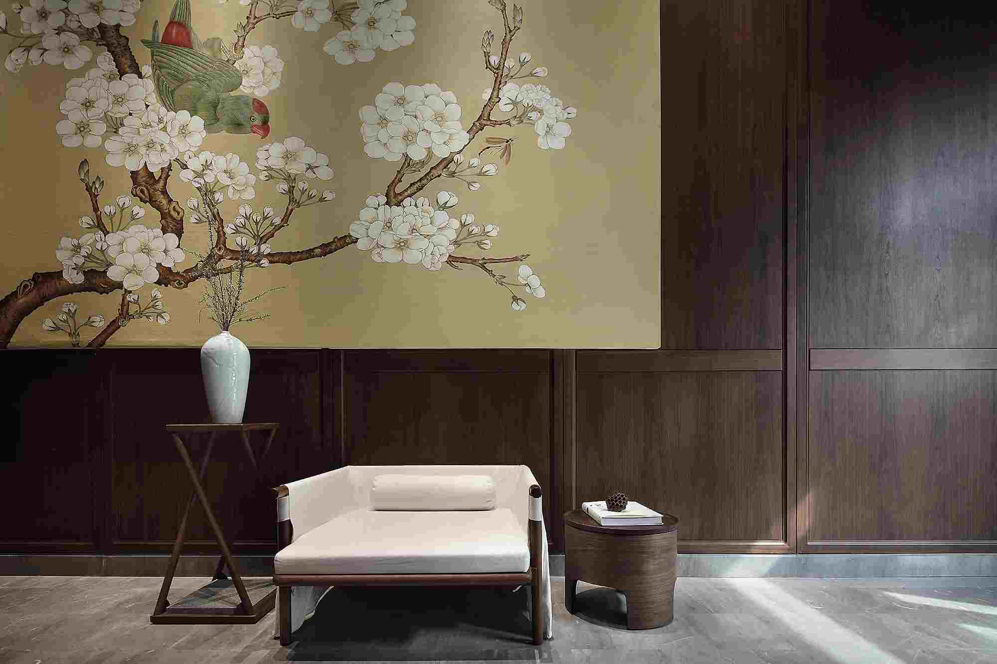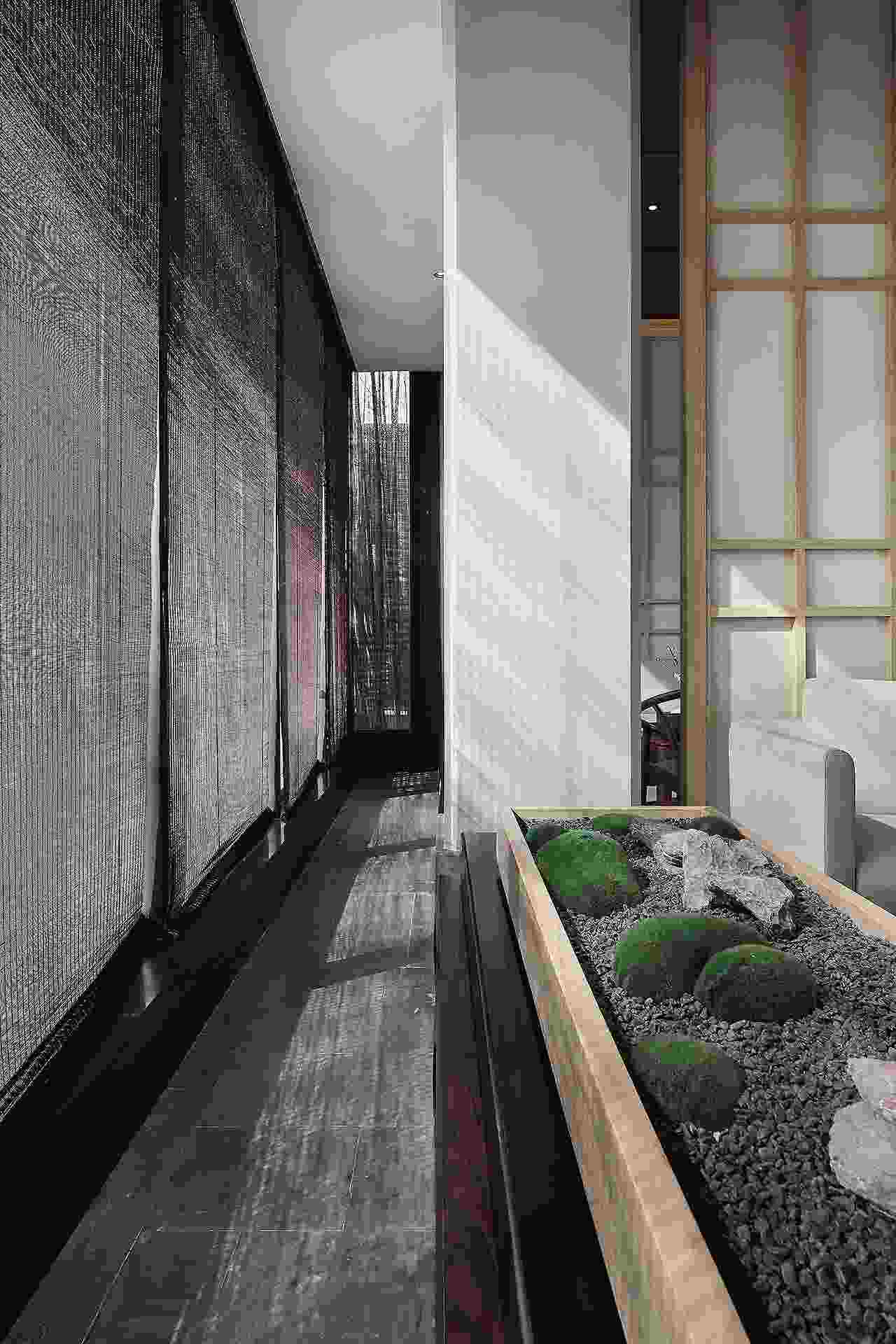 空間主體青灰色系打底,一重一輕兩種木色經(jīng)緯分明的鋪陳于其中,因重復(fù)而形成的序列感讓空間肅然而理性;過道墻面,水池上方,一行金羽鶴正翱翔于海天之間,自得其樂;而過道盡頭,一把椅,一張臺,墻上杏花枝頭鸚鵡獨自嘻戲,空間主旨的待客之道信手拈來。