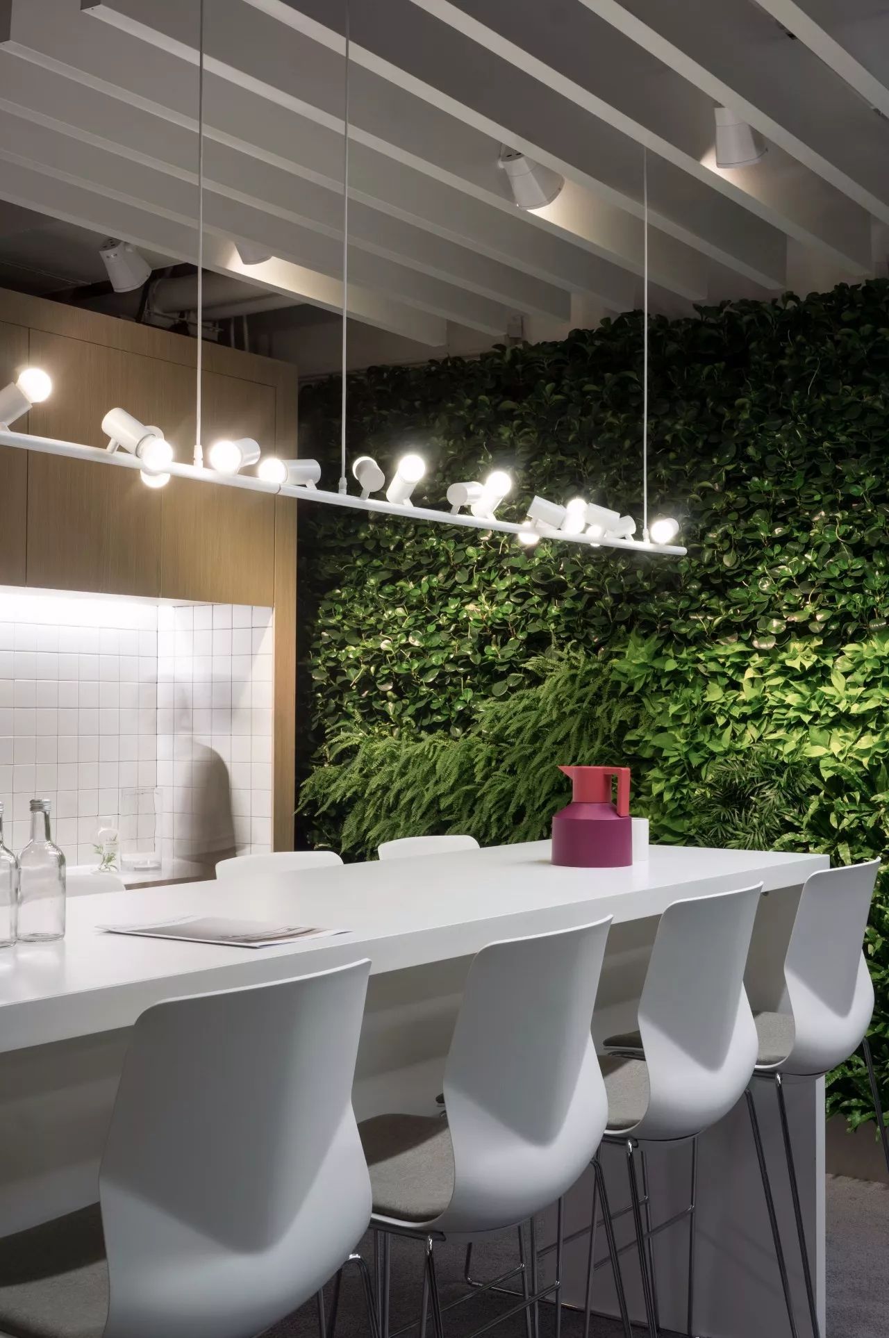 為了弱化傳統(tǒng)辦公室的緊張氛圍,公共休閑區(qū)配置了特別大的面積,包括大面積的垂直綠化墻、廚房及水吧。成為員工聚會(huì)、休息,或工作交流、頭腦風(fēng)暴的聚集地。模塊化的沙發(fā),能實(shí)現(xiàn)多變的組合方式,以及滿足員工360度全方位的無障礙溝通。