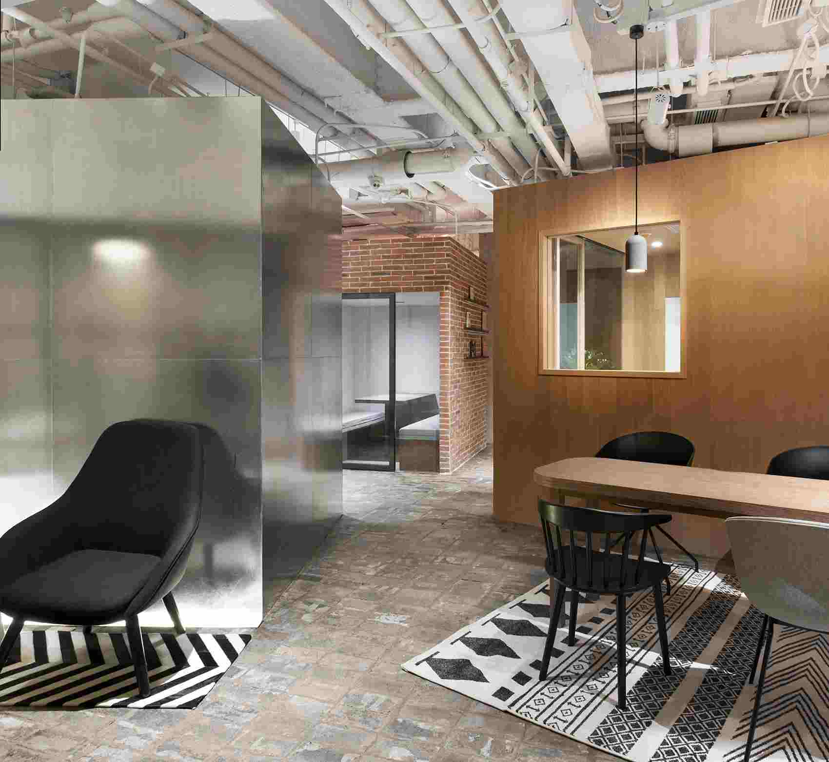 入口處,兩扇2000mm寬的大門設(shè)計,當(dāng)玻璃門打開時,室內(nèi)和走廊形成了相對開放的空間。房間使用了不同的材質(zhì),鍍鋅鋼板,水泥板,木板,紅磚,作為盒子的表面材料。地面則使用了灰磚,地面的破舊感和房子的不同材質(zhì)的對比,形成很大的反差,給人以強(qiáng)烈的視覺沖擊力。