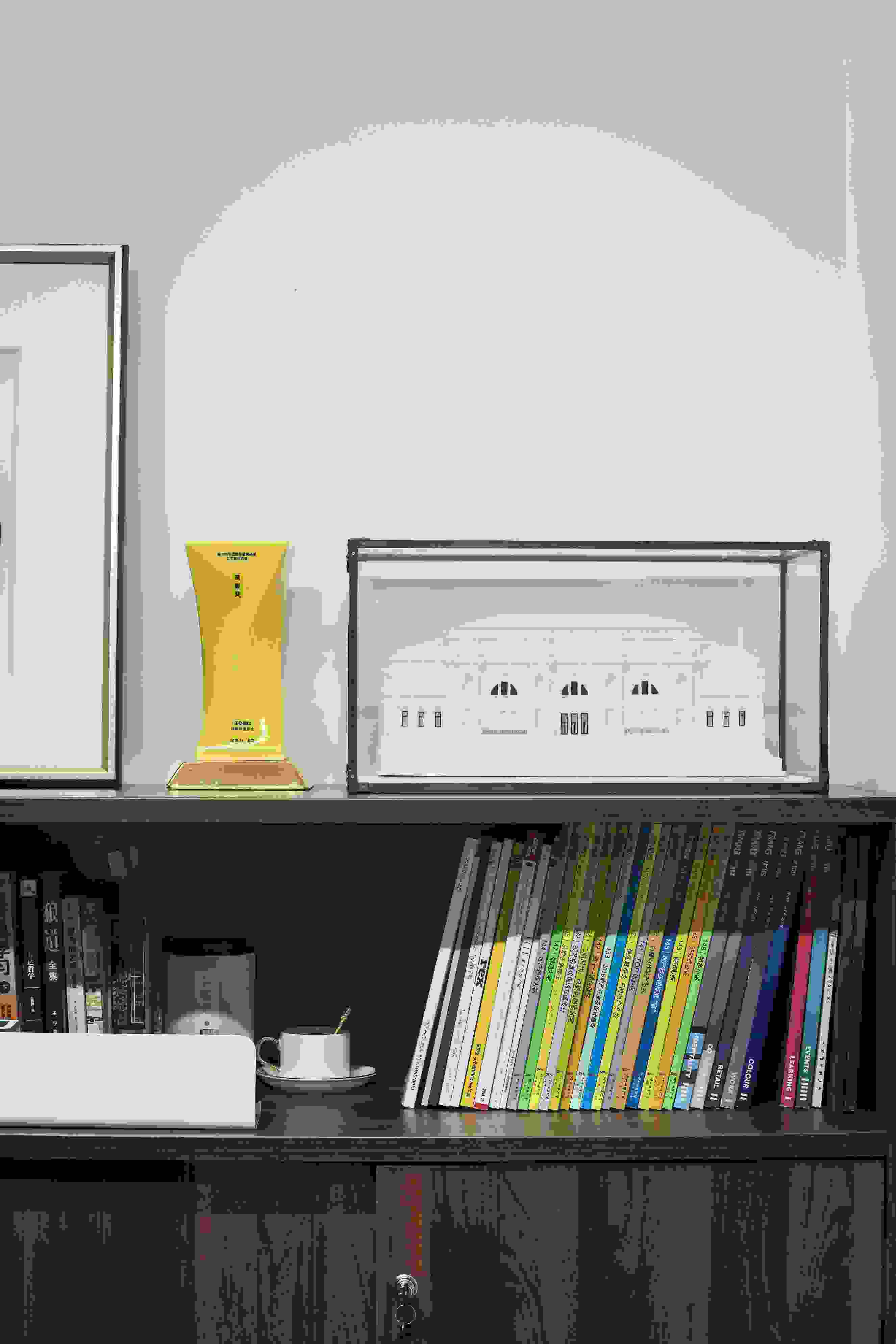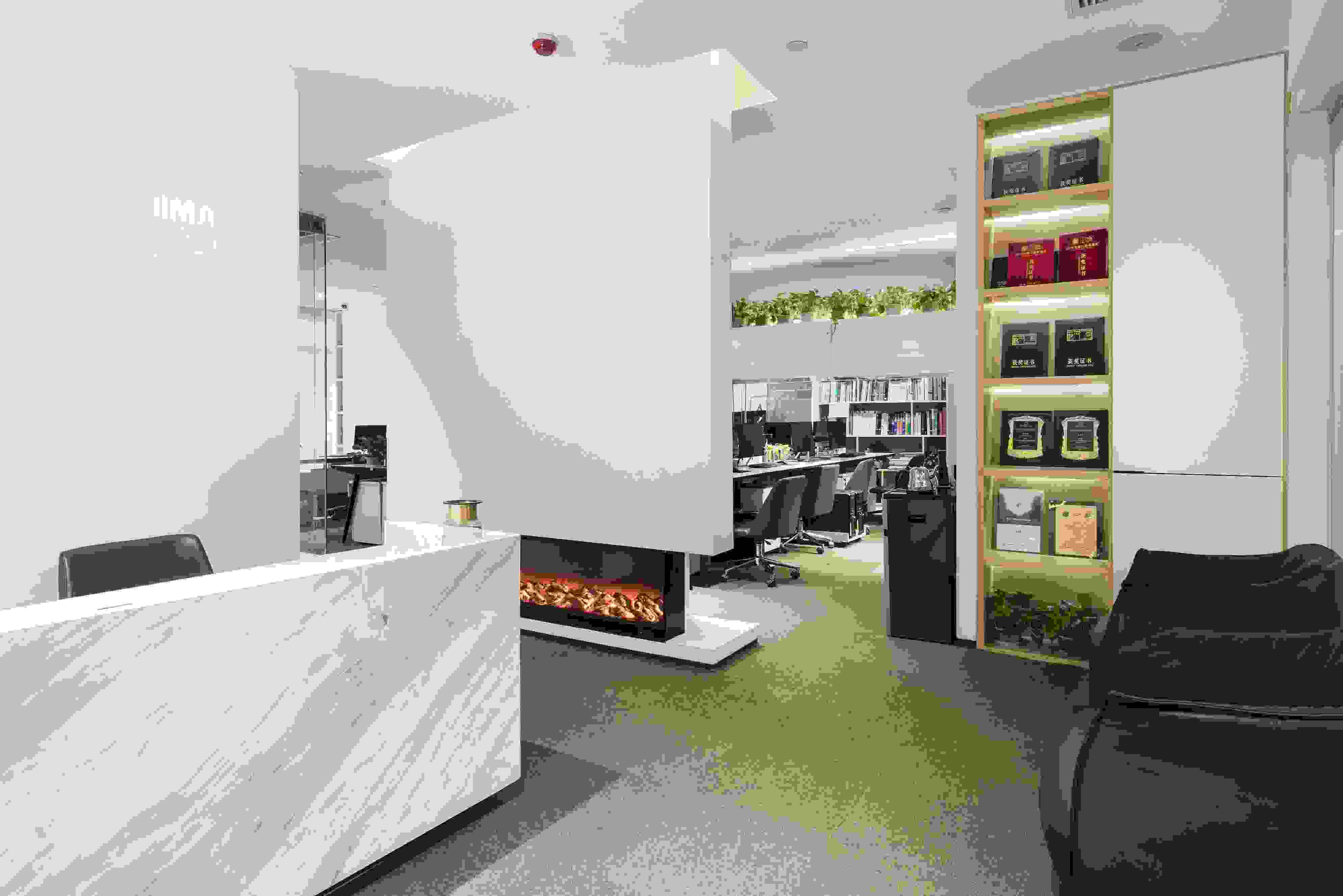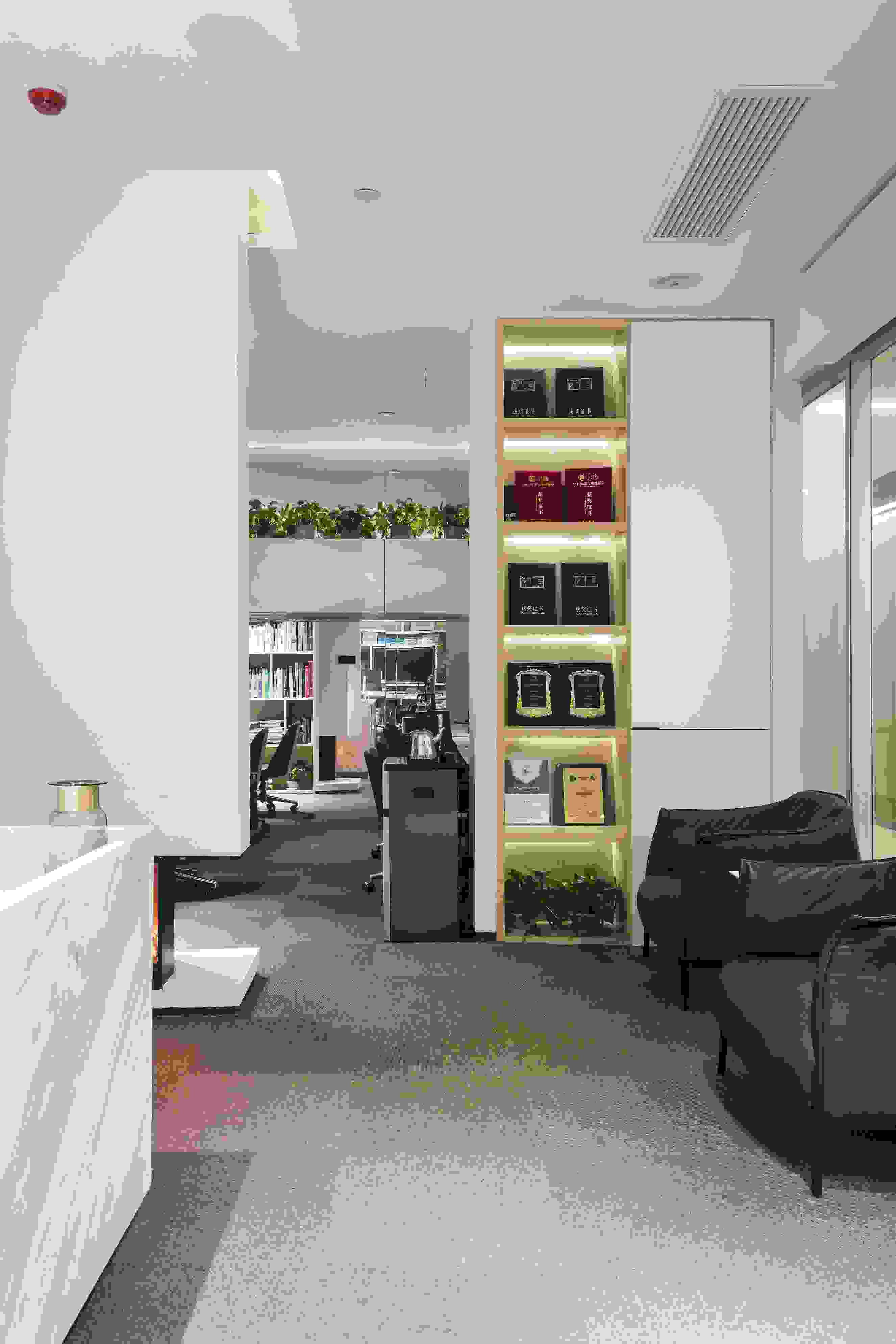 室內(nèi)的墻身以簡(jiǎn)約紋理的乳膠漆配搭木書櫥,極簡(jiǎn)中不失秩序,結(jié)合暖光燈帶、大理石前臺(tái)和地毯,使空間感覺更加舒適自在。