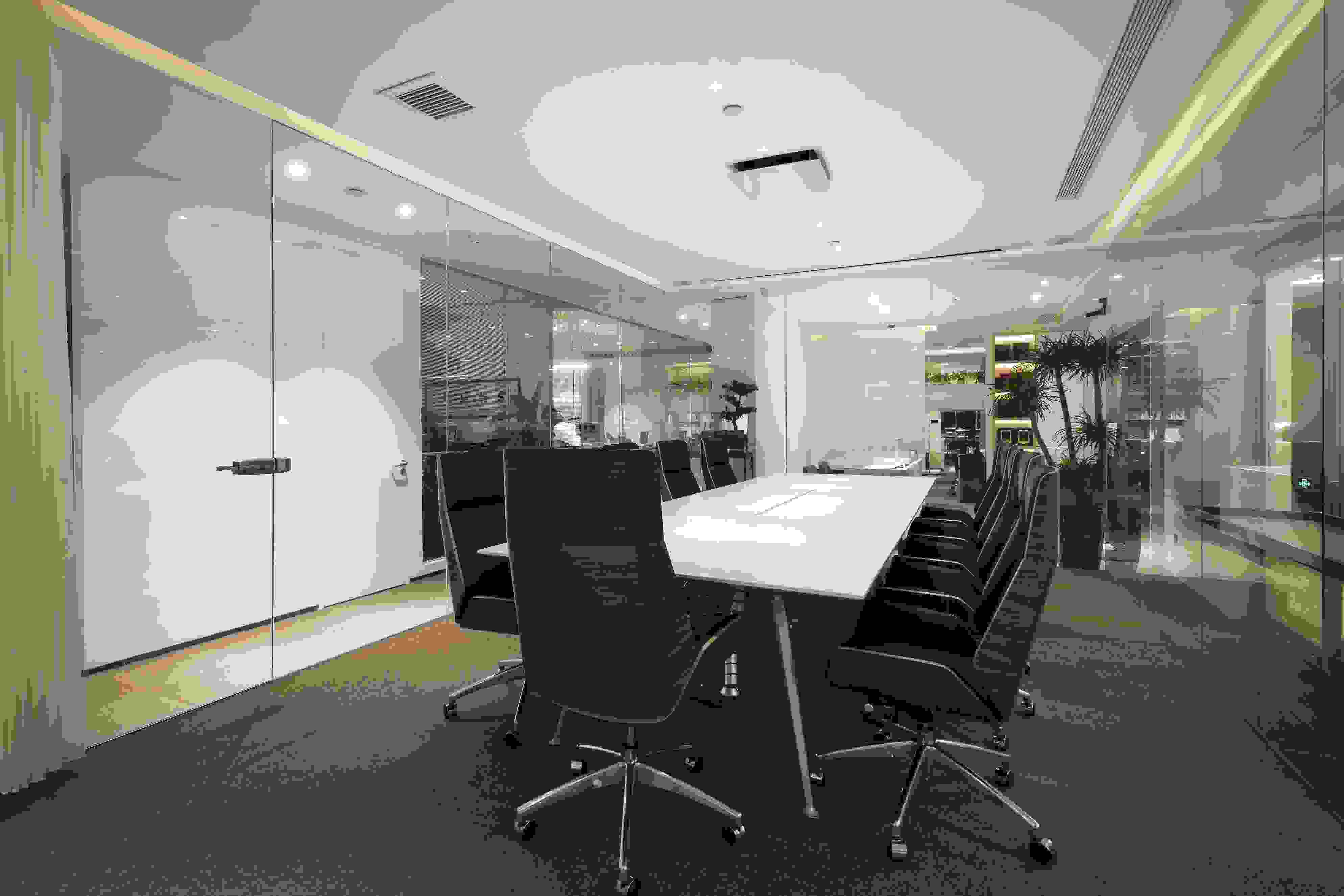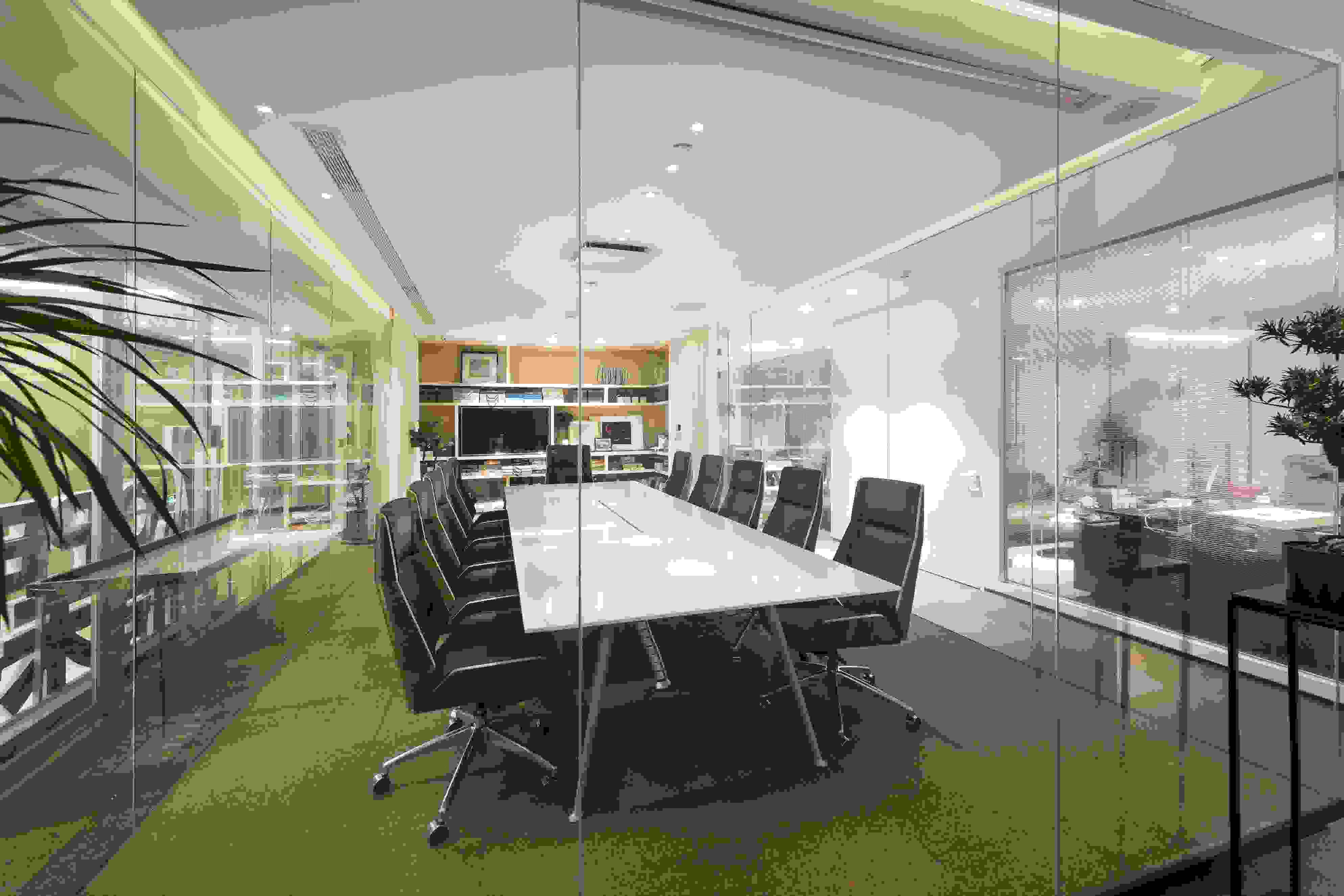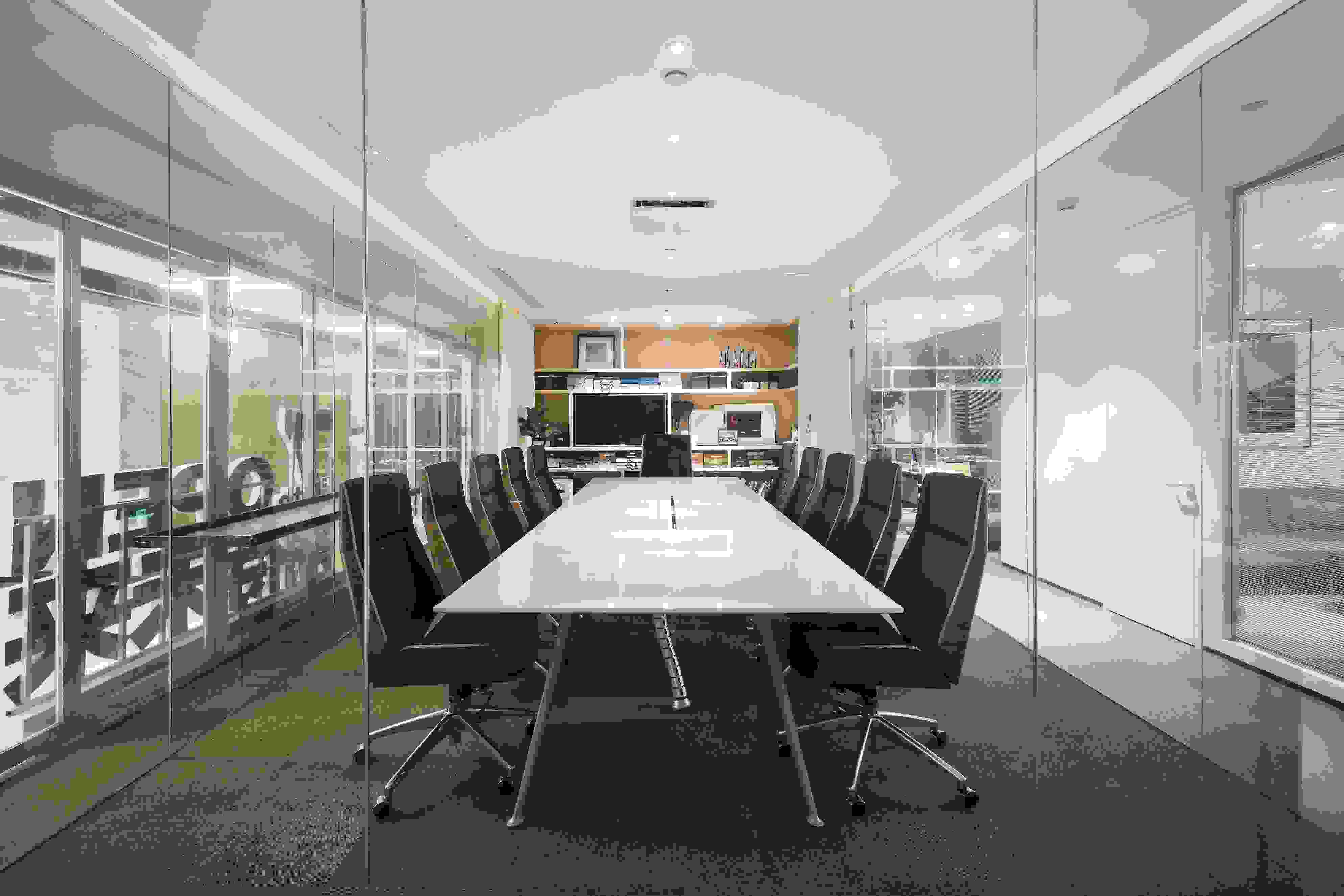 會(huì)議室以玻璃盒子為設(shè)計(jì)想法,運(yùn)用二次空間的形式,清楚地展示了空間里人與人之間的互動(dòng)。