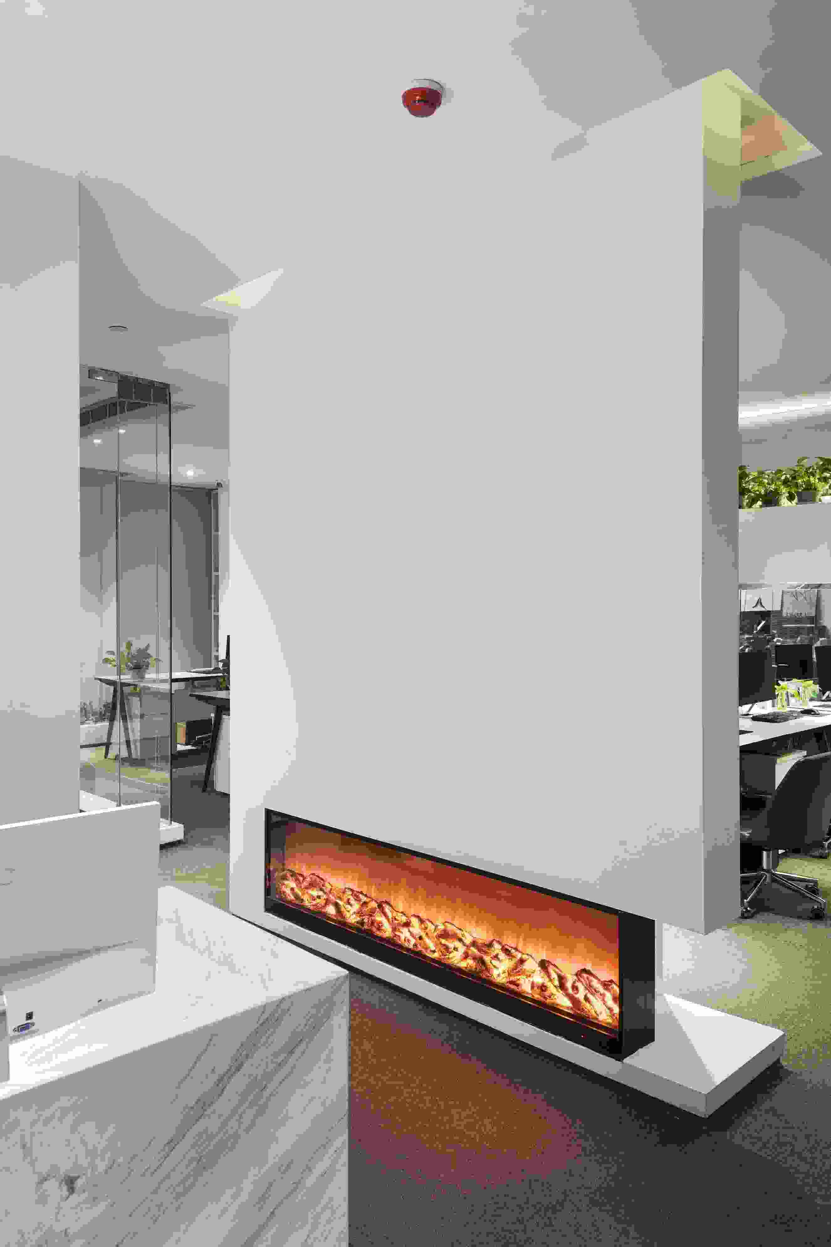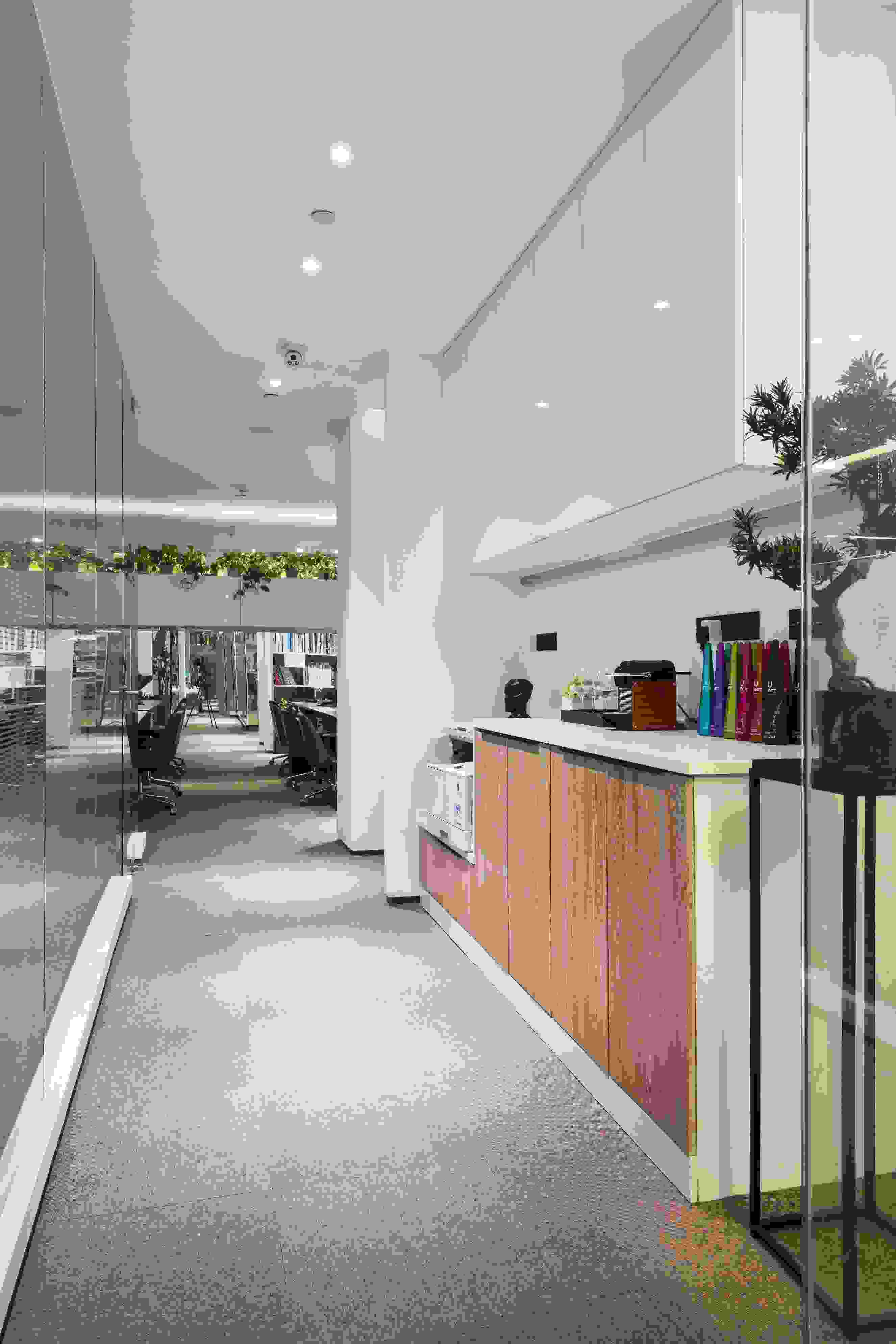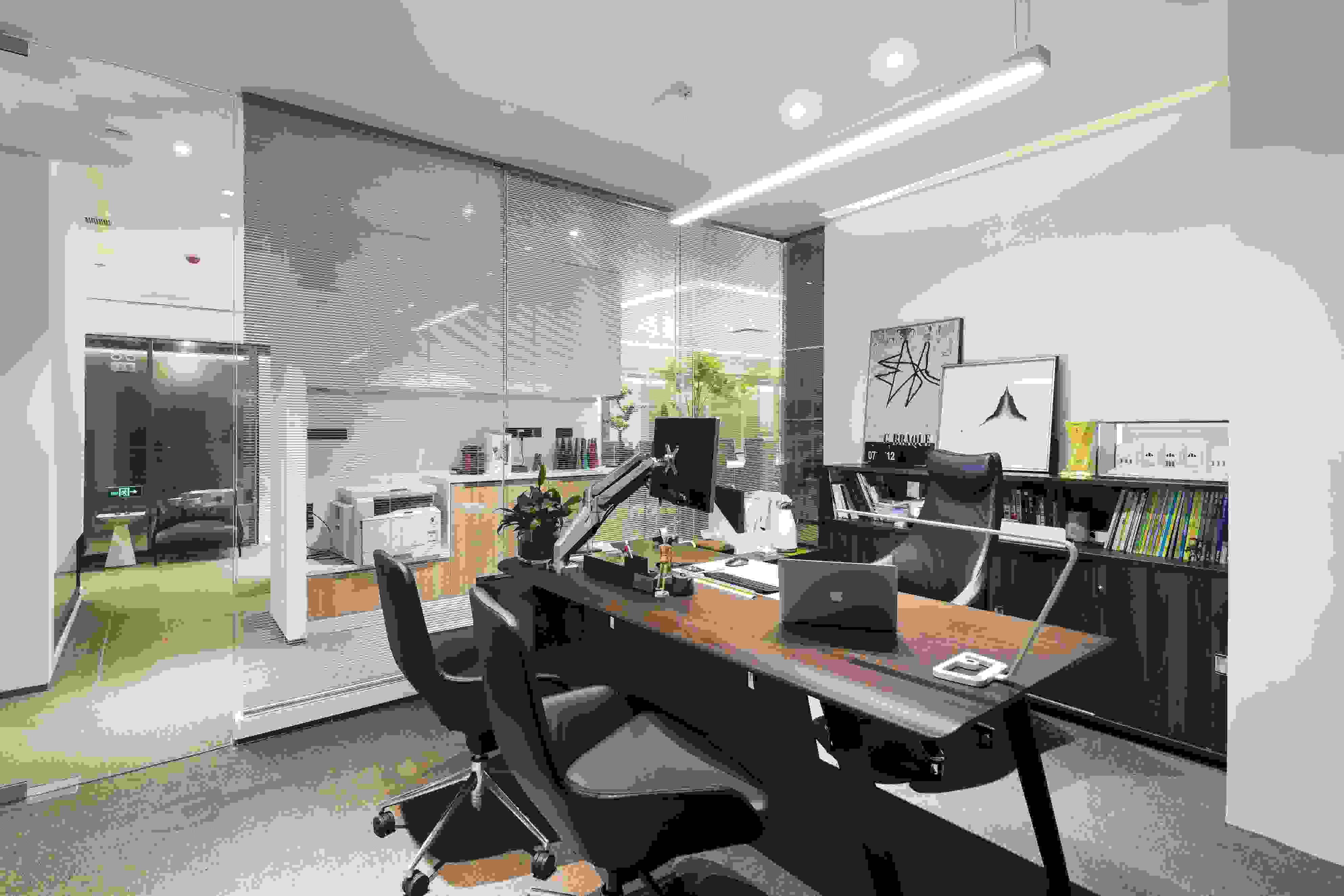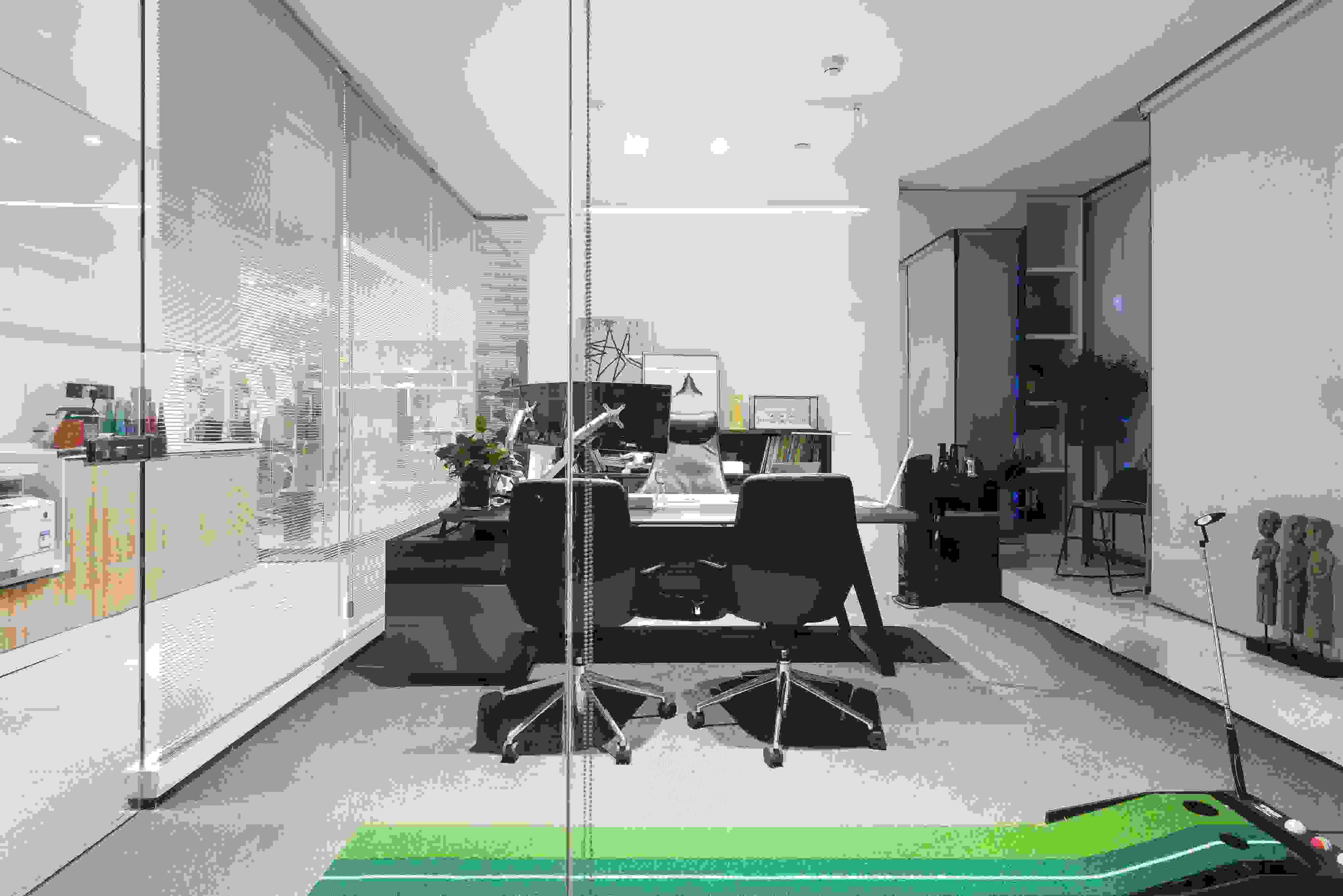 會(huì)議室以玻璃盒子為設(shè)計(jì)想法,運(yùn)用二次空間的形式,清楚地展示了空間里人與人之間的互動(dòng)。
