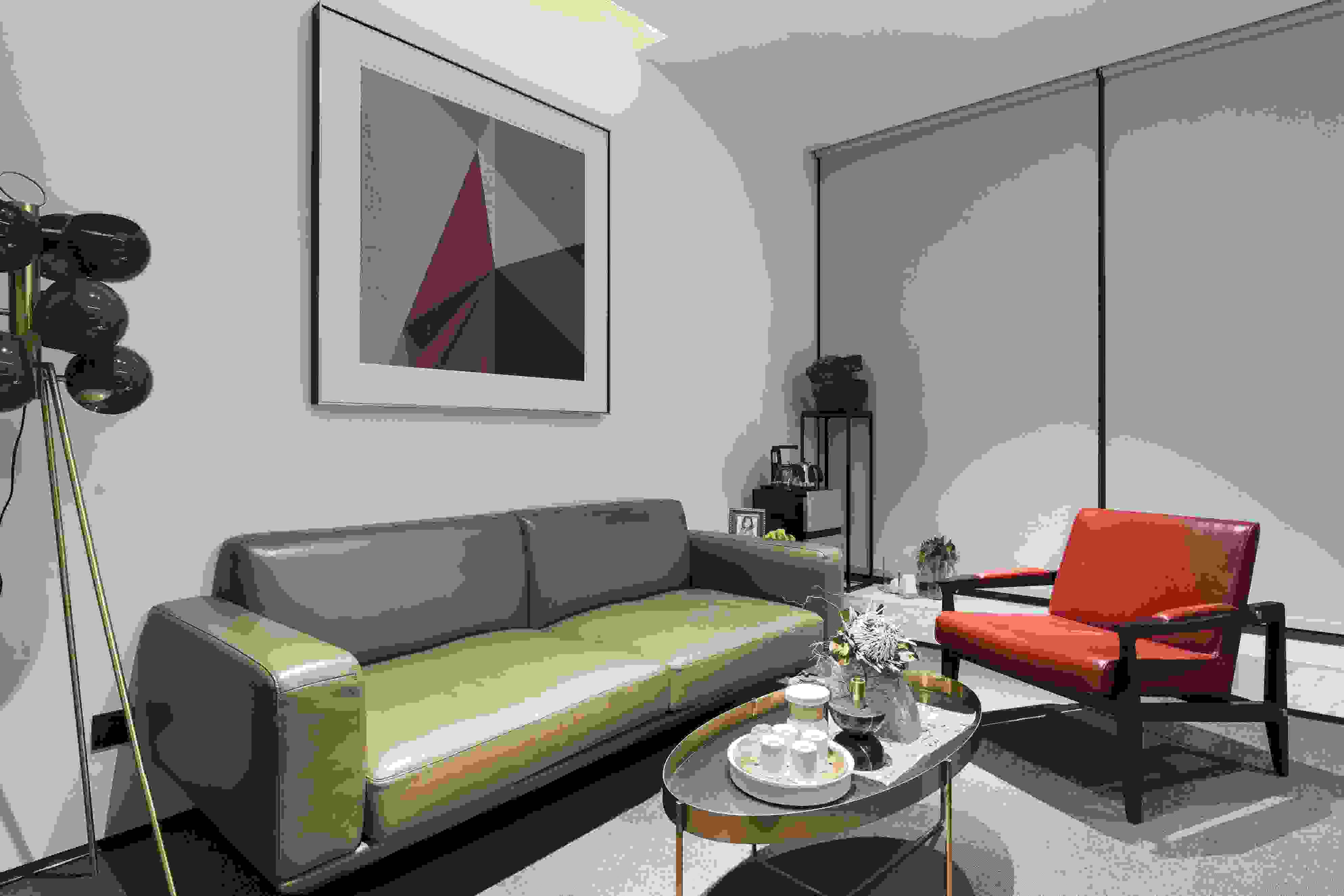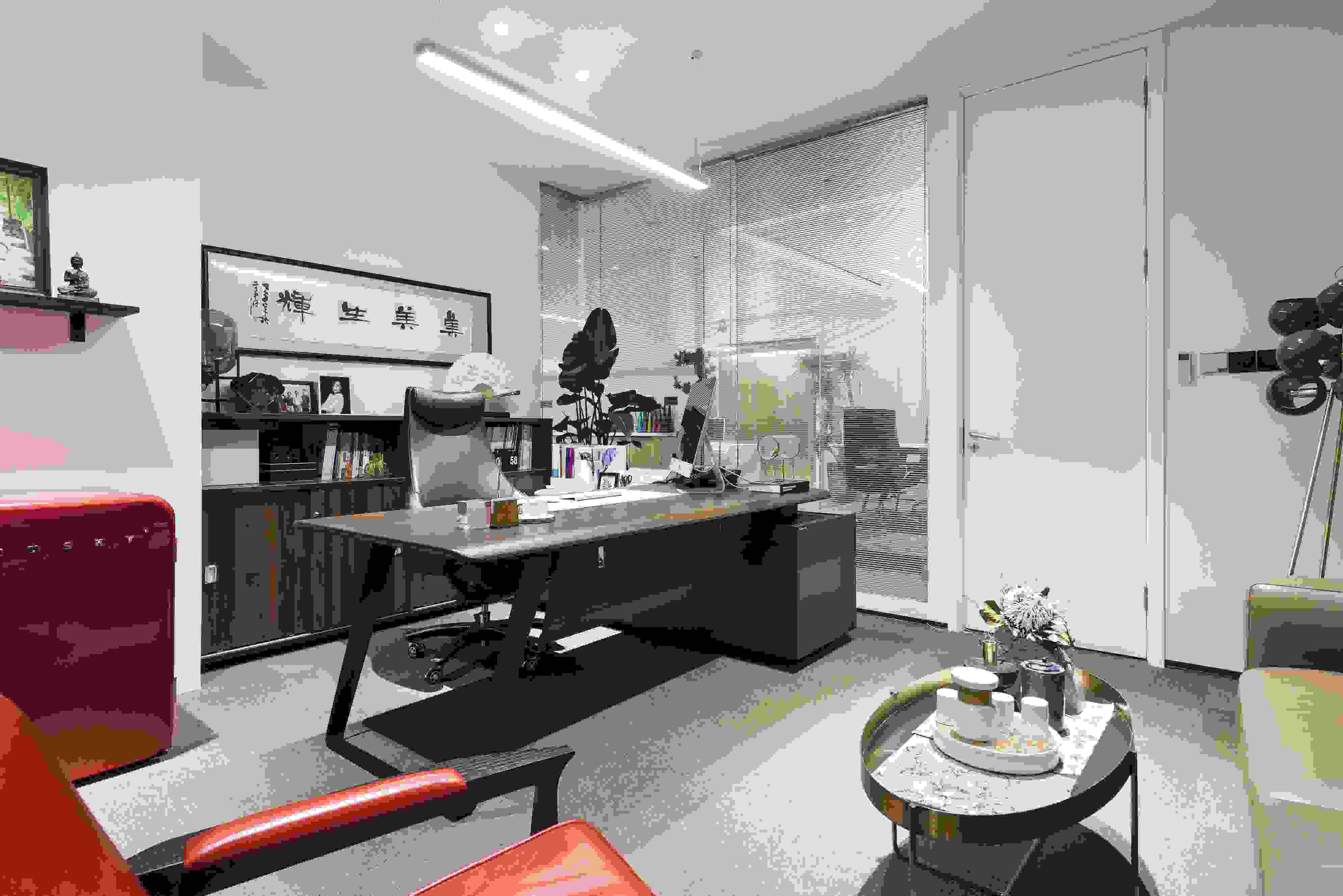 辦公室內(nèi)細(xì)膩出色的裝飾,遵從自然優(yōu)雅的原則,尊重原有空間的形態(tài),座椅和冰箱選用了跳脫的紅色,突出空間的視覺色彩。