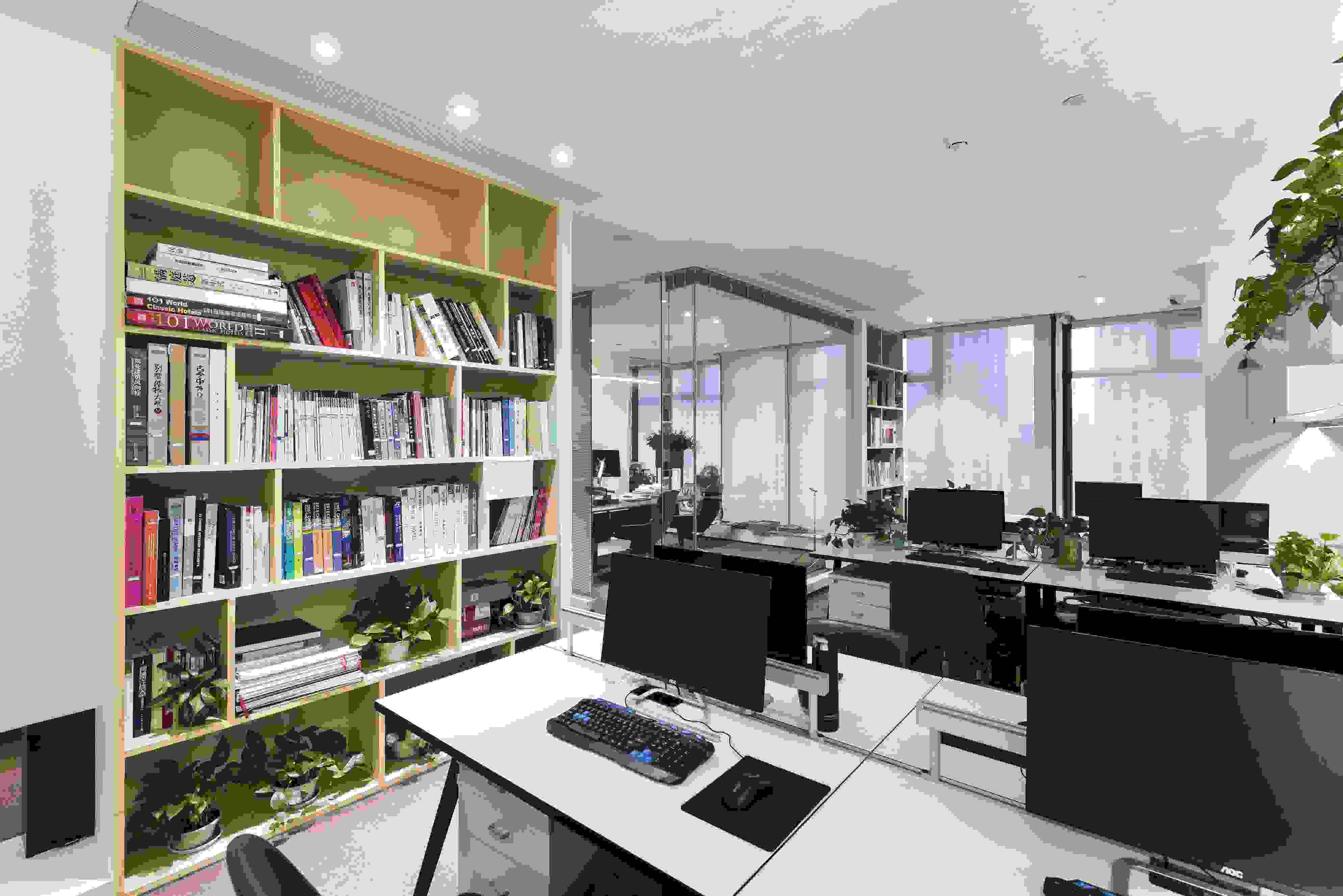 室內(nèi)過(guò)度空間(如閱讀區(qū))提供了人與人之外的交流,室內(nèi)空間采用單純的材質(zhì)和線條,配以鏡面和綠植,營(yíng)造清晰、舒適的辦公環(huán)境。
